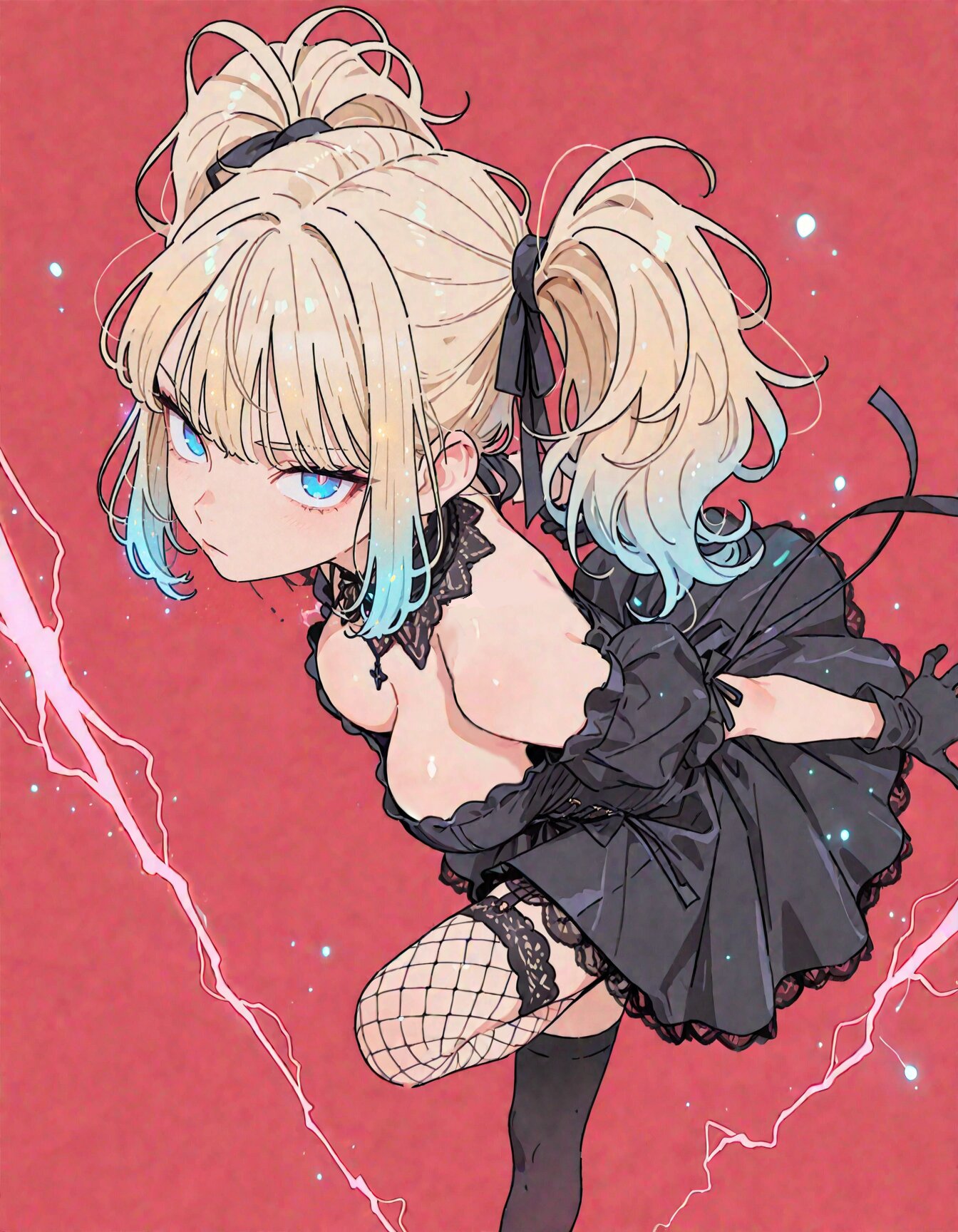 from side, looking at viewer fullbody (from above,looking up:1.2) looking at viewer, 1girl, mature female, blonde hair, medium hair, messy hair, wide twintails, big hair, black ribbon, blue eyes, tsurime, sanpaku, goth fashion, black dress, off shoulder, bare shoulder, off-shoulder dress, puffy short sleeves, black gloves, detached collar, lace collar, underbust, large breasts, miniskirt, lace thighhighs, black thighhighs, asymmetrical thighhighs, single fishnet thighhigh, black arm ribbon fidgeting, fleeing, knee up, (simple background:1.0), red background, masterpiece, best quality, amazing quality, very aesthetic, absurdres, newest, professional art lots of details, , overexposure, shiny-glistening, (watercolor style:1.0), (pastel color style:0.0) 4ur4_illu,shiny, glowing, glowing particles, glowing light particles, light particles, red lightning <lora:noline (1):-0.5> <lora:sdxl2-flat2-512b:0.15> <lora:facelightup_xl_v10:0.5> <lora:V2_yakumo_alchemy:0.5> <lora:Aura_illu:0.1>