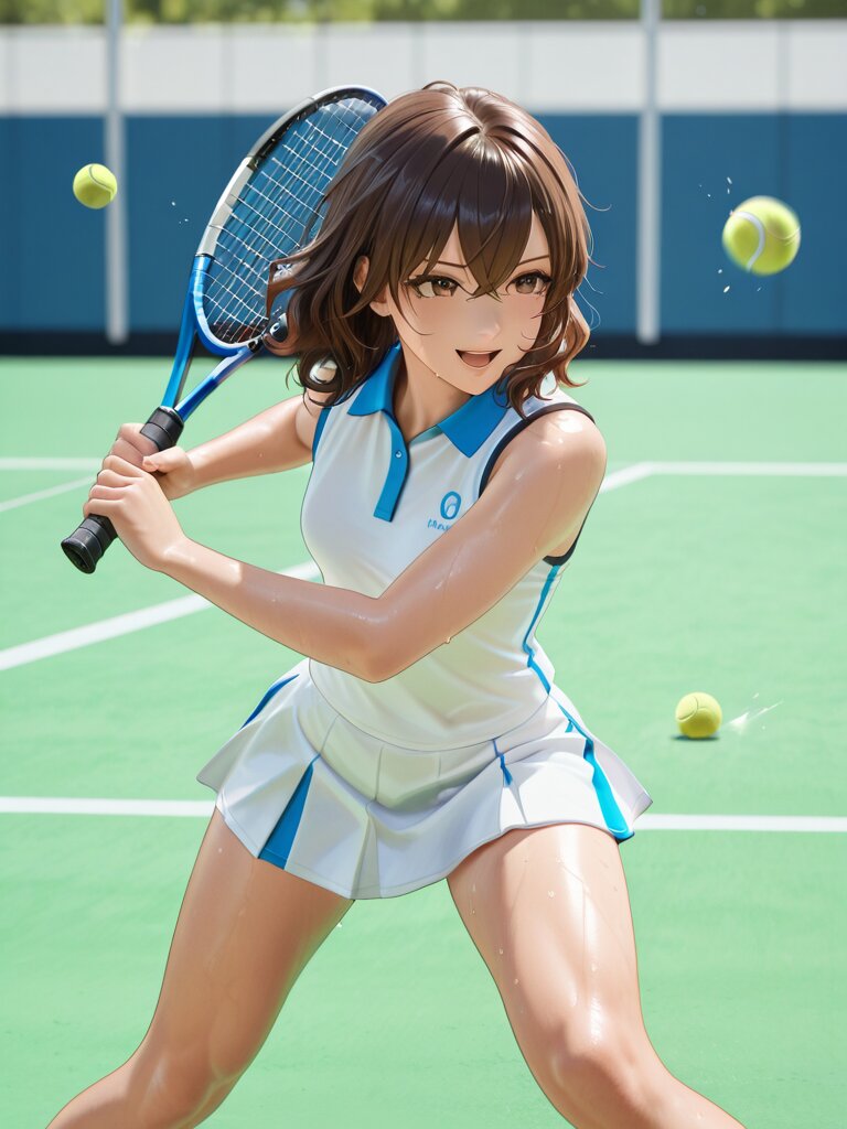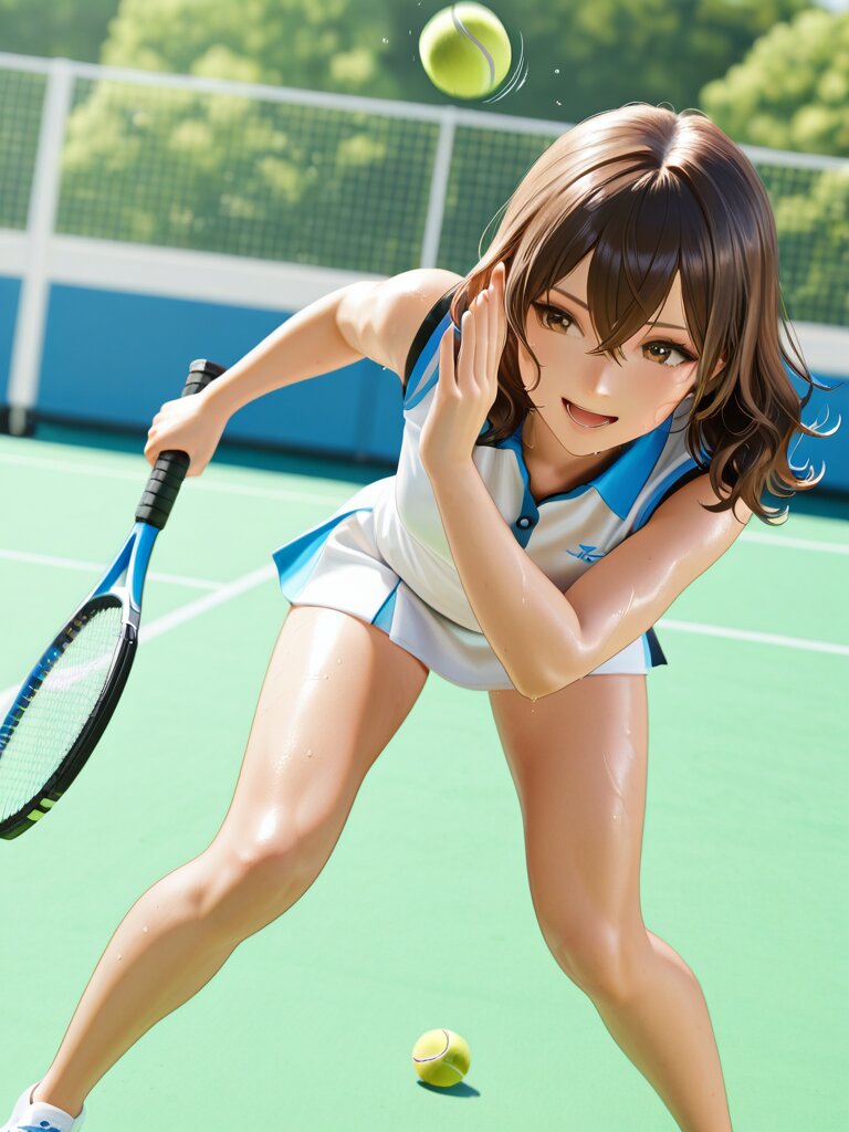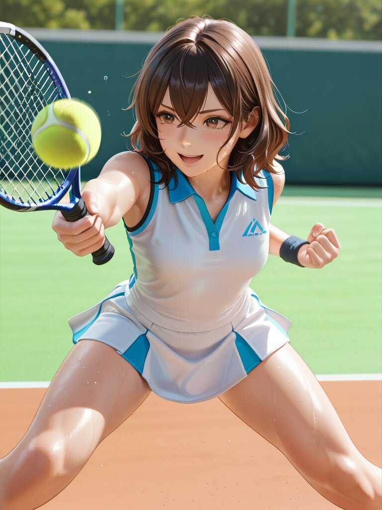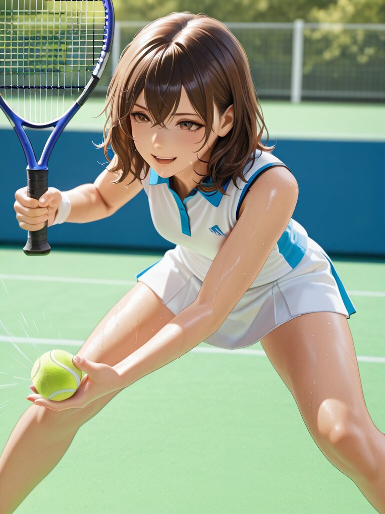 結果、”Open_Stance, Hitting_Stance, (Hitting_Tennis_Ball:1.3), Playing_Tennis, Swinging,”が一番安定して欲しい結果が出ているのではと言うのが現時点での状況です。今後、思いっきり変化するとは思いますが、今回はここで力尽きました(汗。因みに5枚目はNGです。勿体無いので掲載しましたw。
