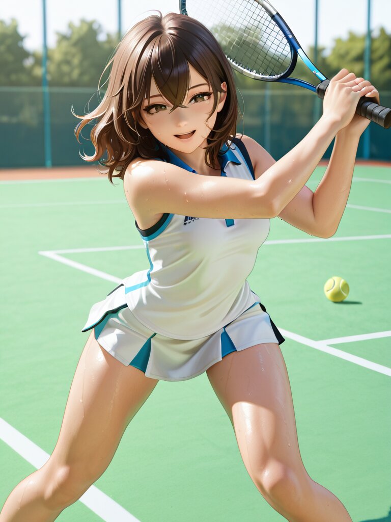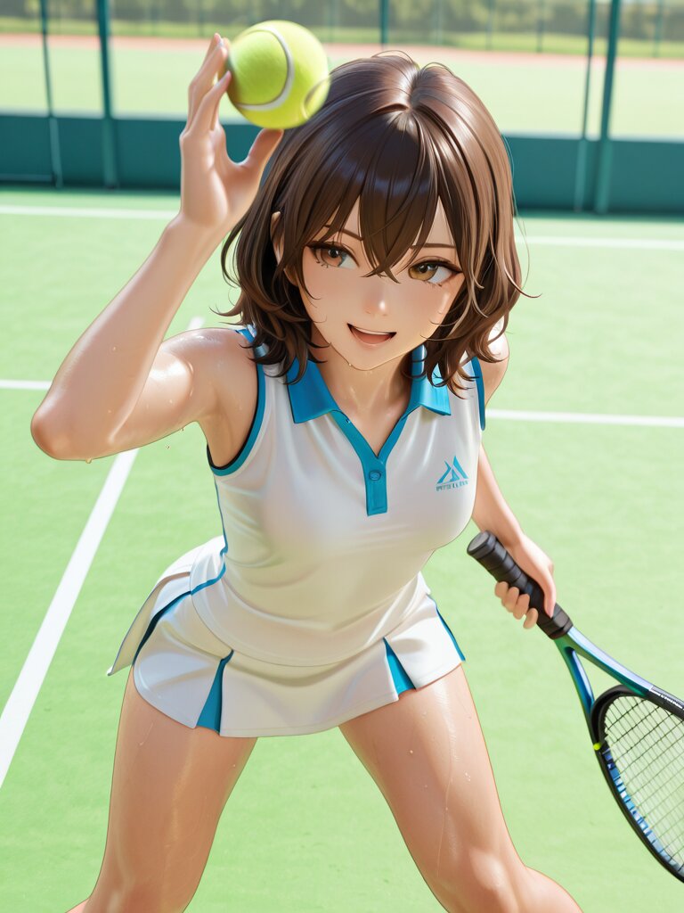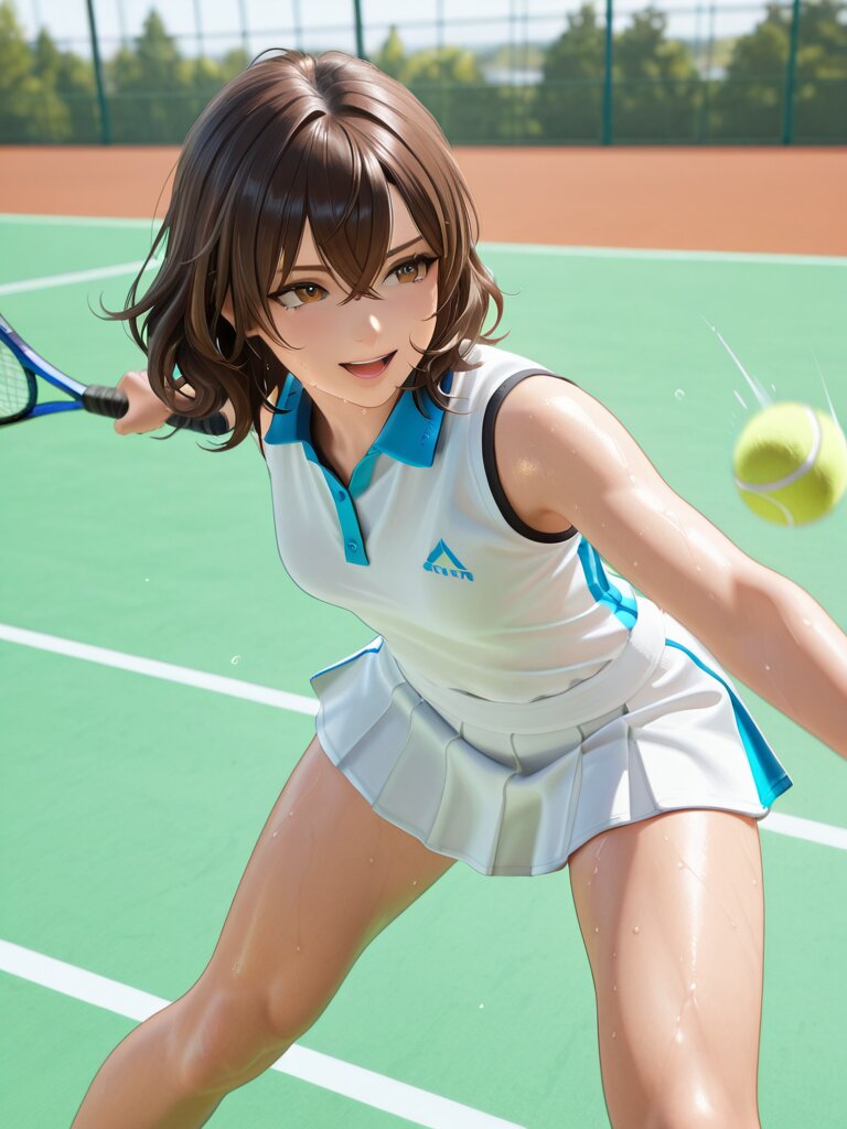 Masterpiece, Best Quality, Amazing Quality, Very Aesthetic, High Resolution, Ultra-Detailed, Absurdres, Newest, Scenery, 3D, Rendered, General, 1Girl, Fair_Skin, Mature_Male, Aged_Up, Small_Breasts, Holding_Tennis_Racket, Tennis_Uniform, Taut_Clothes, Brown Eyes, Crossed_Bangs, Brown_Hair, Wavy_Hair, Medium_Hair, Light_Smile, Sweat, Open_Mouth, Standing, Open_Stance, Hitting_Stance, (Hitting_Tennis_Ball:1.3), Playing_Tennis, Swinging, Legs_Apart, Leaning_Forward, Outdoors, Tennis_Court, Day, BREAK, Depth of Field, Volumetric Lighting,