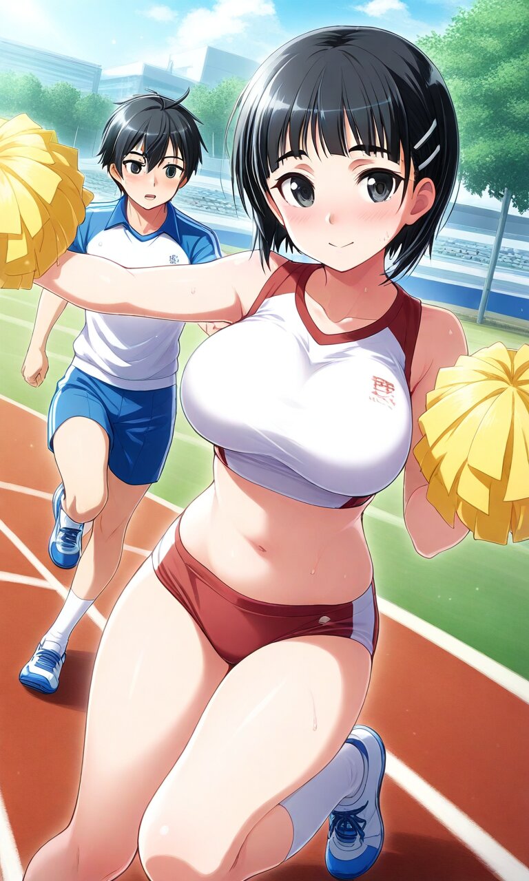 Couple, boy and girl, two people only,absurdres, ultra-detailed, master piece, high resolution, 8k, Boy, girl, couple,NSFW, masterpiece, best quality, extremely detailed, full color, beautiful detailed young woman, shiny skin sweating from activity, eyes focused, young man, in track uniform , cheering at sports day event, school ground with running track and crowd, sunny afternoon, perfect anatomy, explicit competitive tease. BREAK the boy(original boy,black hair,short hair, black eyes) BREAK the girl(suguha, short hair, hairclip, large breasts,, )