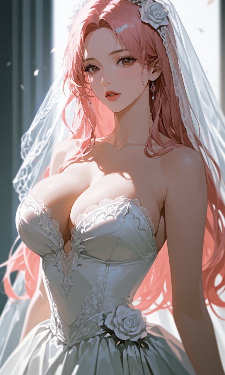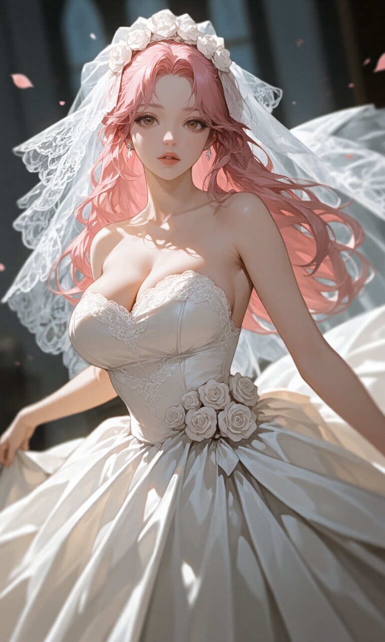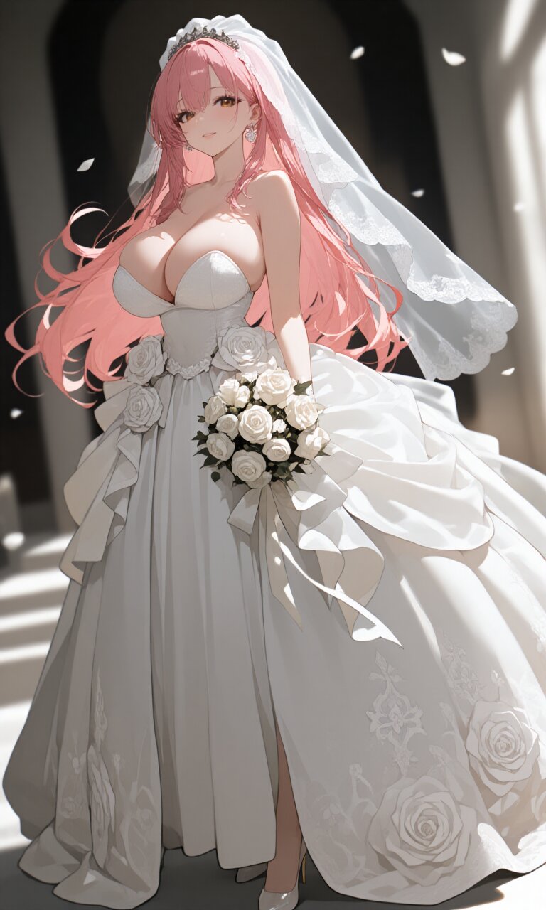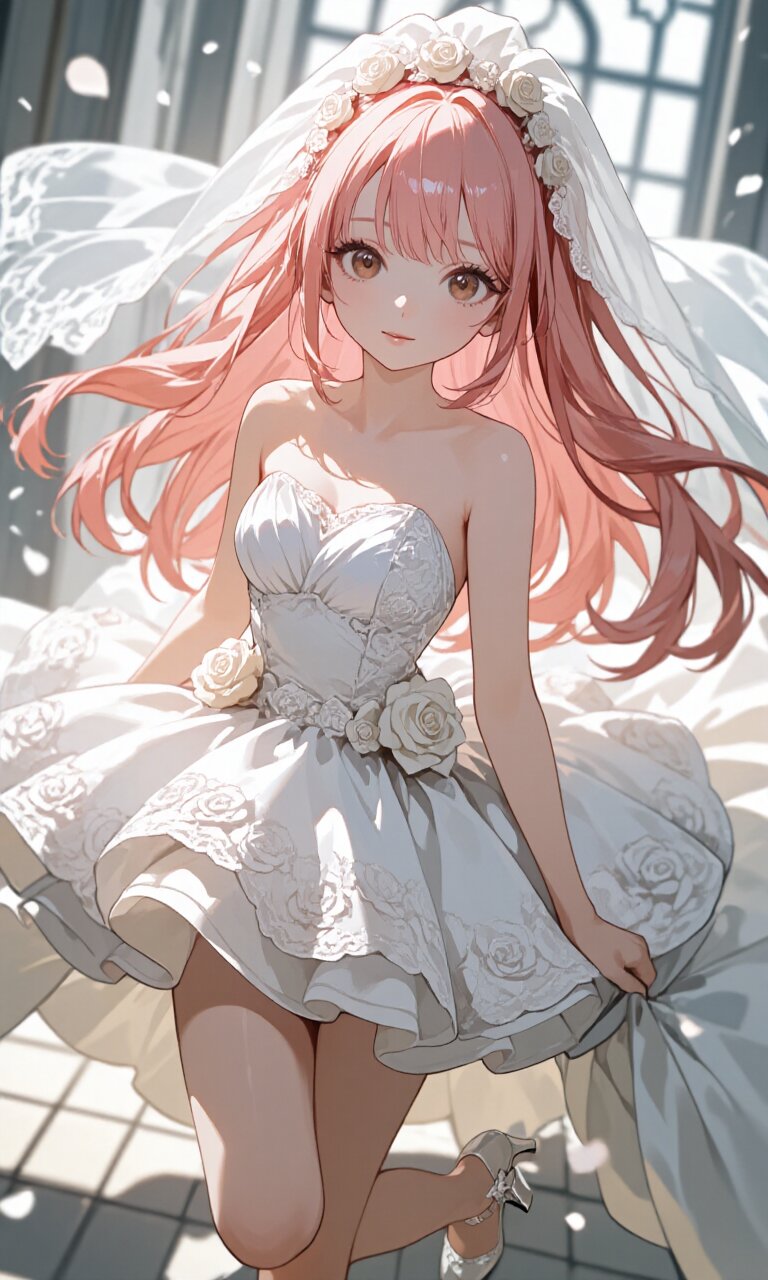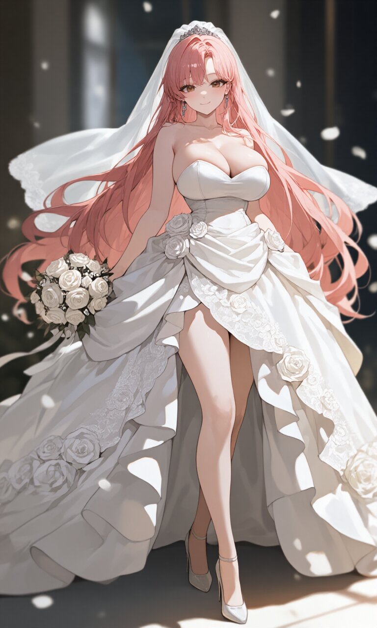 Masterpiece, high quality,pink long hair, brown eyes,eyelashes,clevas,point breasts,covered with a gathered strapless wedding dress, white rose accents on the waist, and white rose-patterned organdy lace over the dress,high heels,
