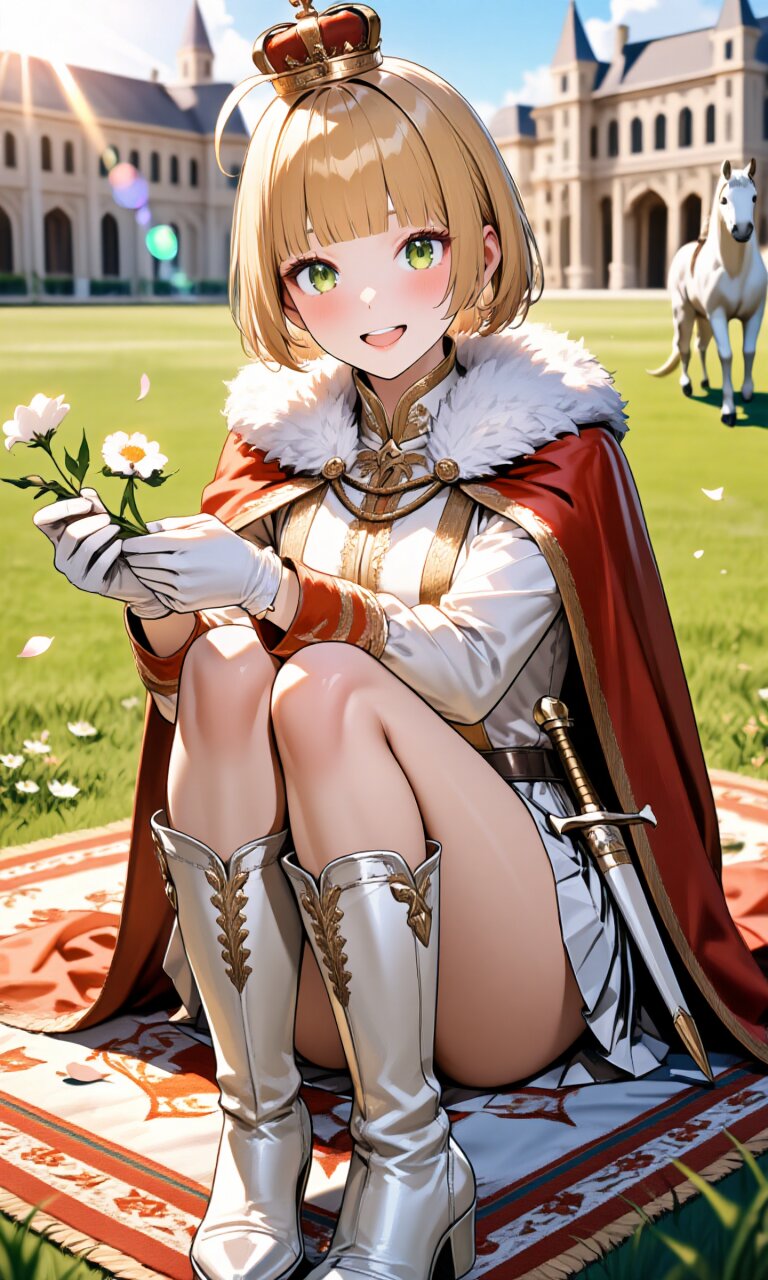 A young man with short blonde hair and blunt bangs sits gracefully on a luxurious square carpet in a medieval European setting, dressed in an elegant White Prince costume with a red cape draped over his shoulders. His delicate face, framed by an ahoge, features striking green eyes that gaze directly at the viewer with a warm, delighted smile. He wears a mini skirt, white gloves, and luxurious white boots, with a dagger sheathed at his waist and a small crown resting atop his head. Knees drawn up, he holds a flower in one hand while sitting in a sunlit grassland near a grand palace. The afternoon sunlight casts soft beams and lens flares, enhancing the romantic academia atmosphere. A white horse stands nearby, completing the princely aesthetic. The scene is photorealistic with insanely detailed textures, from the fabric folds of his attire to the delicate petals of the flower.
