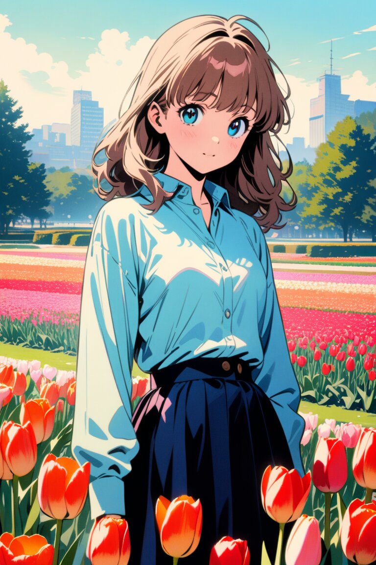 masterpiece, best quality, beautiful detailed eyes, ultra-detailed, finely detail, highres, perfect anatomy, 1girl, solo, retro style, kawaii illustration, city pop picture, city pop colors, 1980s, Kyoto Animation, 1980s fashion, (fine), (tulip field), park, shirt, skirt, sky