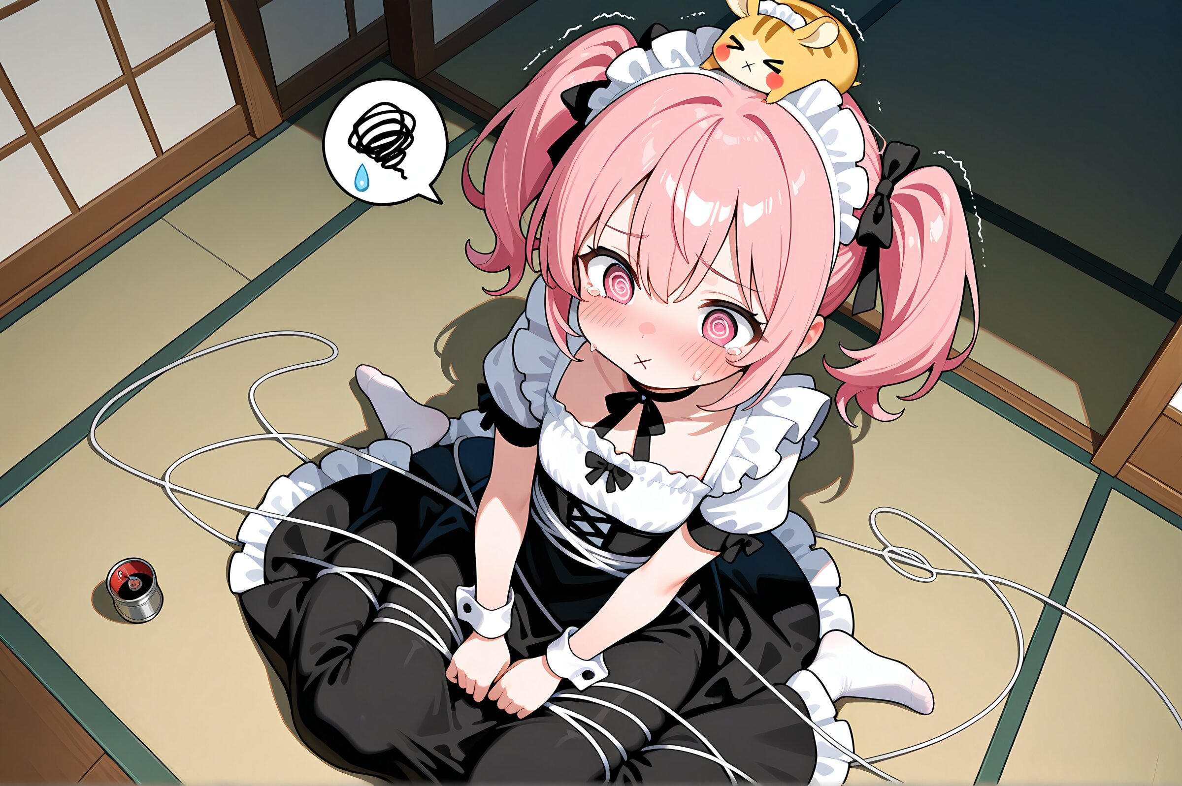 1 little girl solo, diagonal angle, from above, masterpiece, best quality, amazing quality, very aesthetic, pink hair, twintails, pink eyes, @_@, (:x:1.2), troubled, tearful, trembling, blush, sweat, flying sweatdrop, spoken sweatdrop, spoken squiggle, hamsters on her head, > <, choker, maid outfit, long skirt, thread, entangled, holding fishing reel, wariza, japanese room,