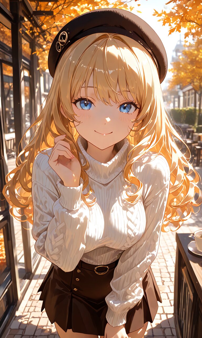 1 lady, long hair, blonde hair, blue eyes, spiral curls, smile, beret, knit sweater, skirt, autumn, cafe,