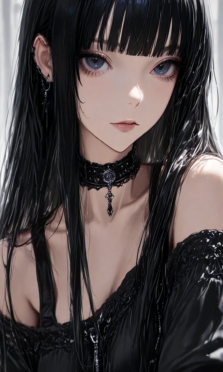 (best quality),(masterpiece),(ultra detailed),1 lady, long hair, black hair, blunt bangs, (choker), goth