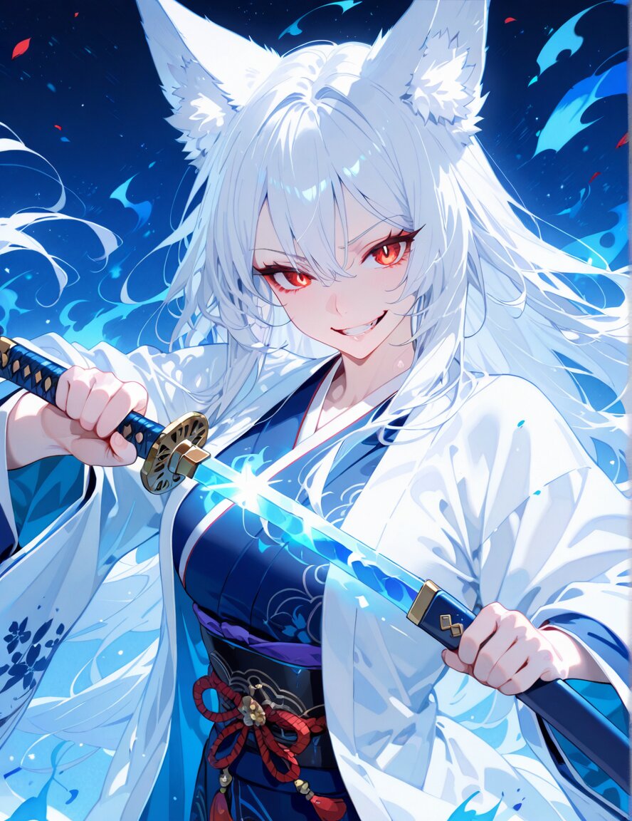 1girl, detailed hair, glowing_white hair, long hair, fox ears, detailed eyes, red eyes, detailed skin, crazy smile, blue kimono, japanese clothes, white haori, blue sword, holding sword, gripping object, unsheathing, holding_sheath, blue flame, blue fire, blue aura, blue background, *1.HassakuXLを使用しています。加筆修正をしている為、そのまま入力しても出力されない可能性があります。*2.SwordMakerを使用しております。