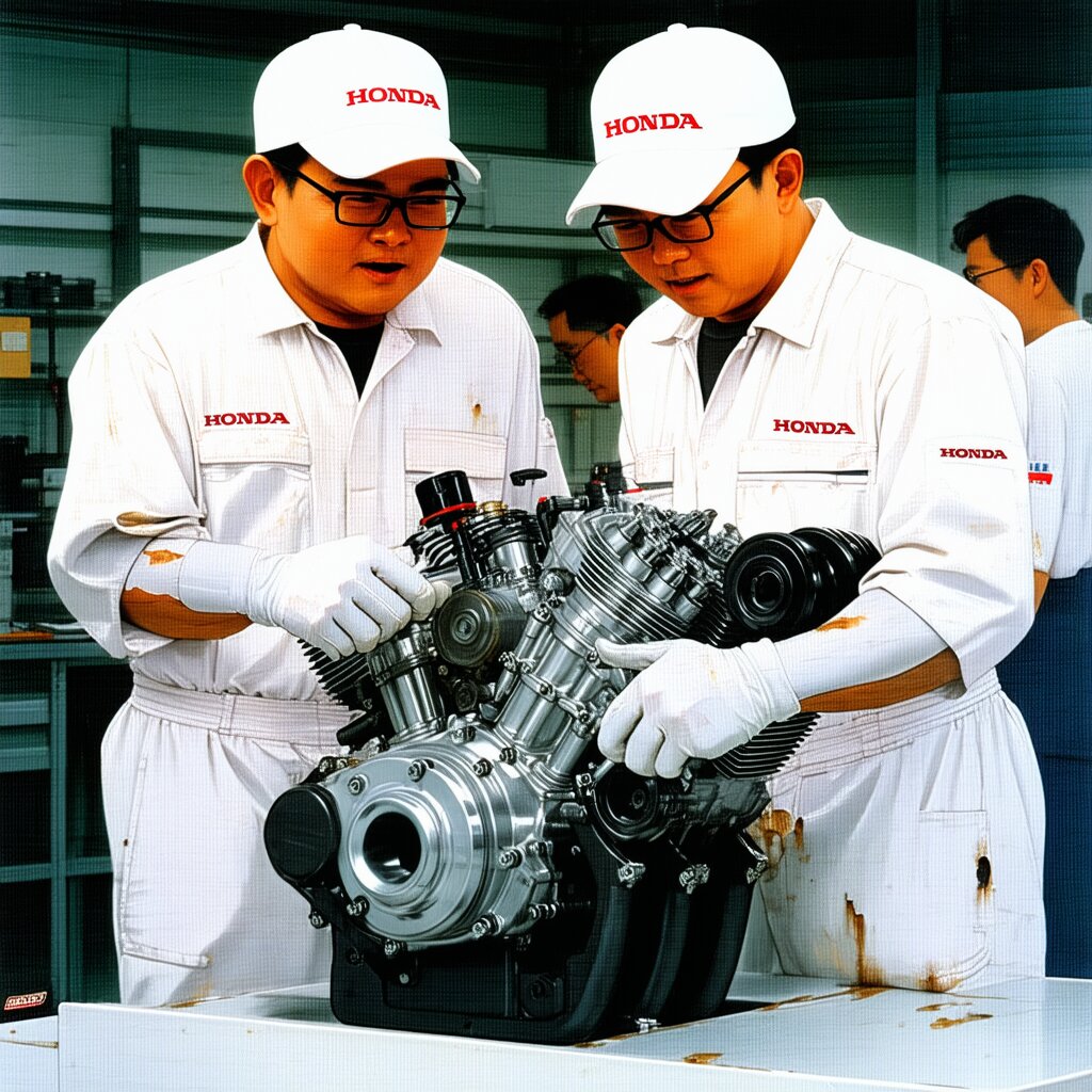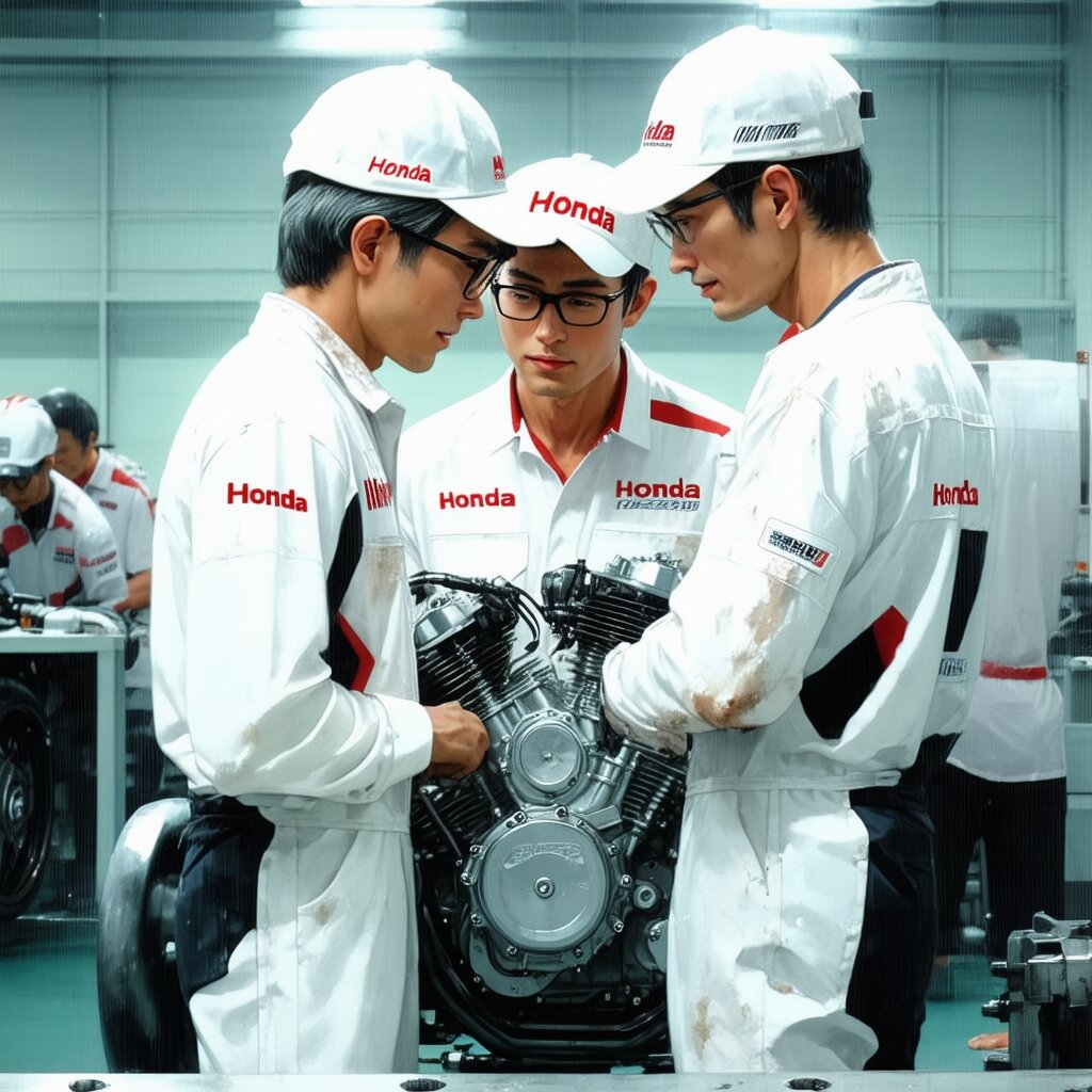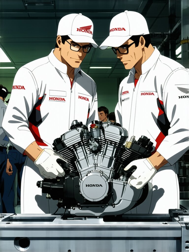 Please draw it in a realistic anime style. Two male Honda engineers are discussing issues with a motorcycle engine placed in the center. The location is the motorcycle engine development room. Both men wear white hats with “Honda” written in red and white jumpsuits. The white jumpsuits are stained with oil in places. One man wears glasses. The other man is not wearing glasses. Other men and women are also busy working in the development room. It has a Showa-era atmosphere and is bustling with energy.
