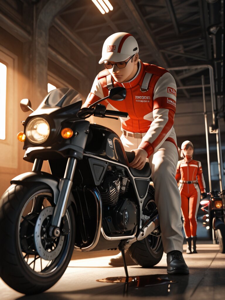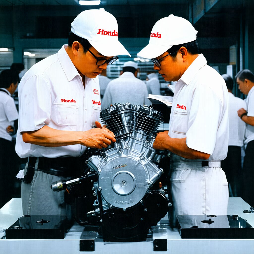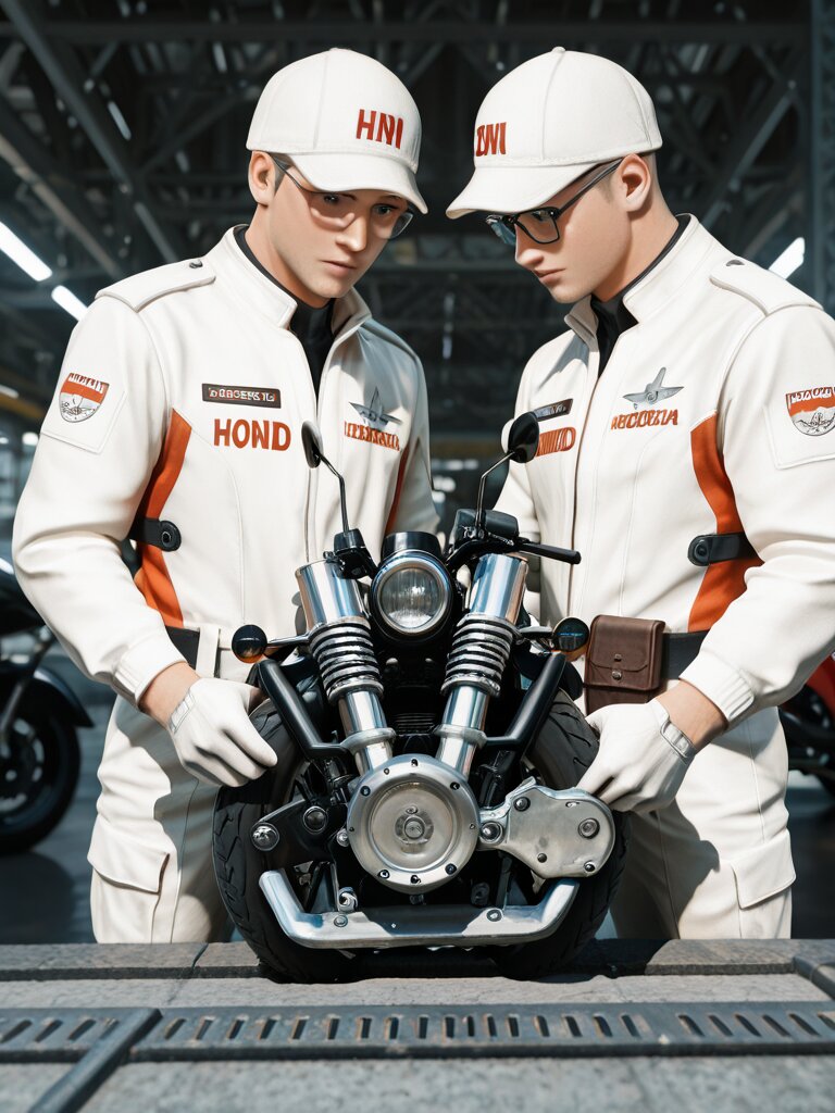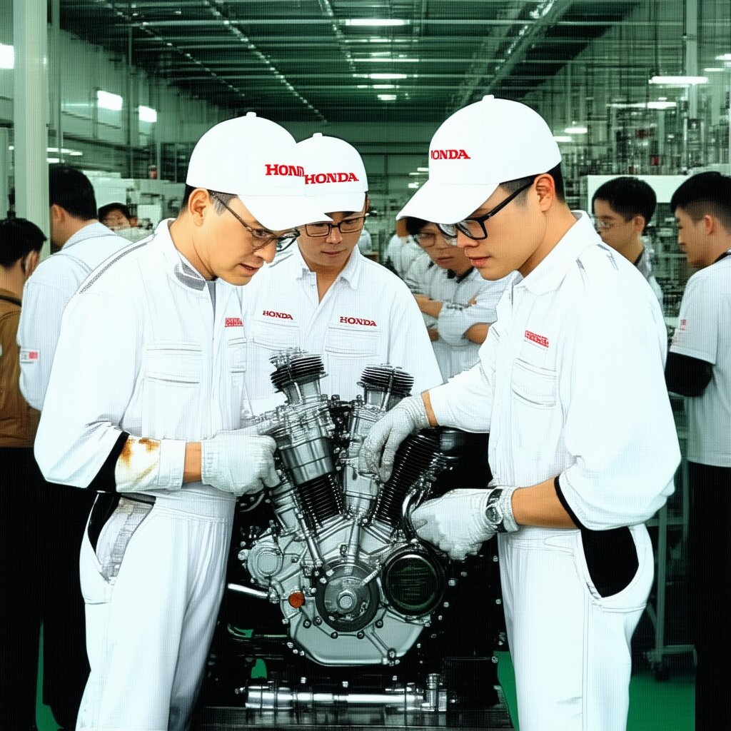 Please draw it in a realistic anime style. Two male Honda engineers are discussing issues with a motorcycle engine placed in the center. The location is the motorcycle engine development room. Both men wear white hats with “Honda” written in red and white jumpsuits. The white jumpsuits are stained with oil in places. One man wears glasses. The other man is not wearing glasses. Other men and women are also busy working in the development room. It has a Showa-era atmosphere and is bustling with energy.