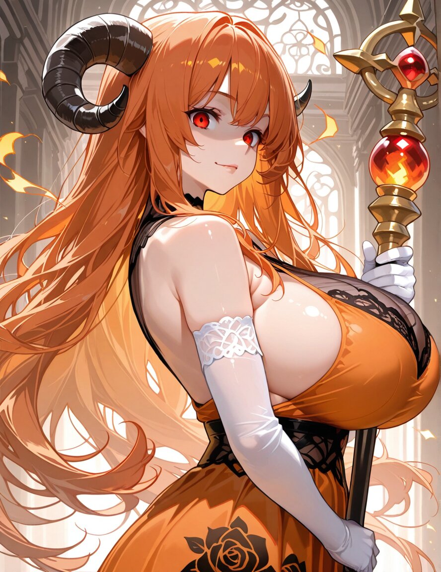 mature woman, sheep horns, detailed hair, orange hair, long hair, detailed eyes, tareme eyes, red eyes, Highlight off eyes, yandere face, shaded face, closed mouth, detailed skin, gigantic boobs, sleeveless, orange dress, black see-through lace print, white elbow gloves, orange Jewelry, khakkhara staff, gripping object, holding khakkhara_staff, yellow flame, orange flame, sunlight, upper body, from side, looking at viewer, *1.HassakuXLを使用しています。加筆修正をしている為、そのまま入力しても出力されない可能性があります。*2.SwordMakerを使用しております。