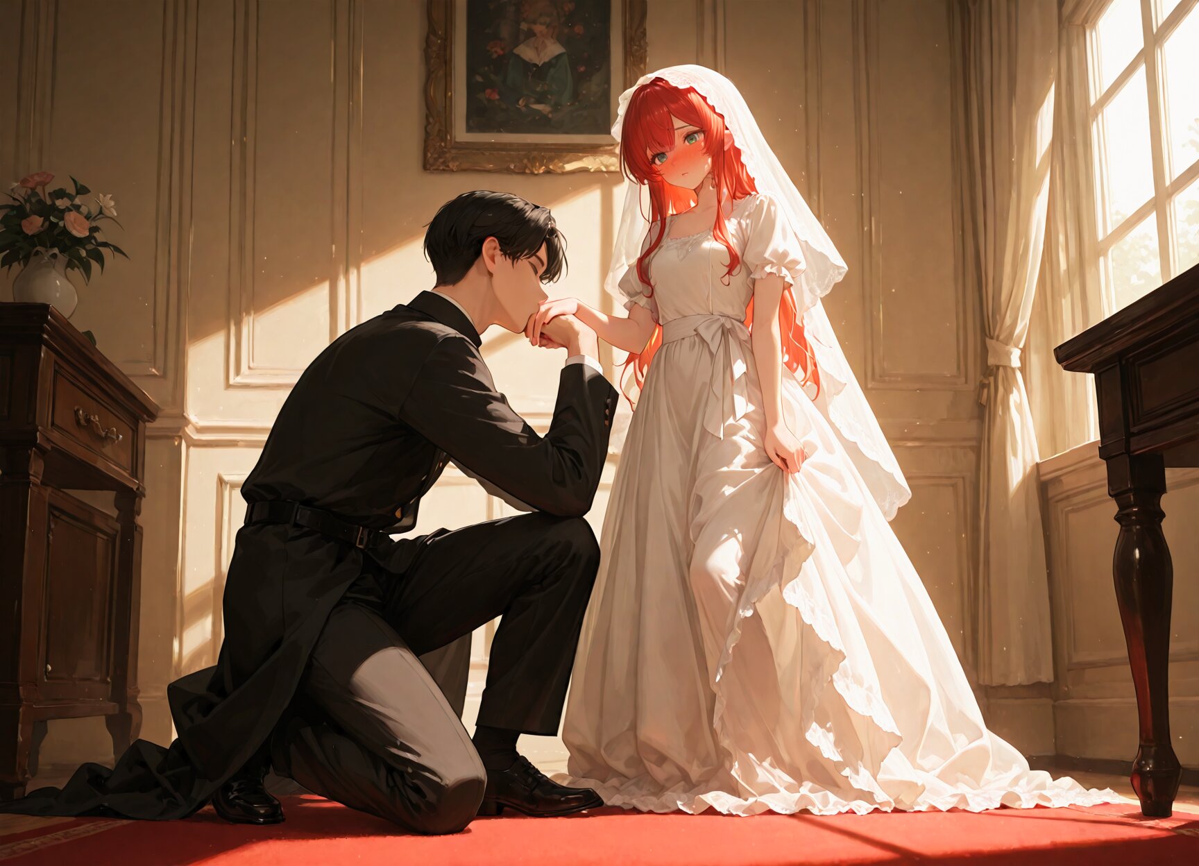 at private room,full body,general, 1girl,1boy, BREAK 1girl,standing,full-face blush,shy, BREAK 1boy,boy on one knee,holding another's hand,kissing hand,, appropriate posture,appropriate configuration,ideal ratio body proportions,perfect anatomy, <lora:Fixhands_anime_bdsqlsz_V1:1>, masterpiece,best quality,newest,absurdres,highres,ultra high res,8K UHD,hyper-detailed,