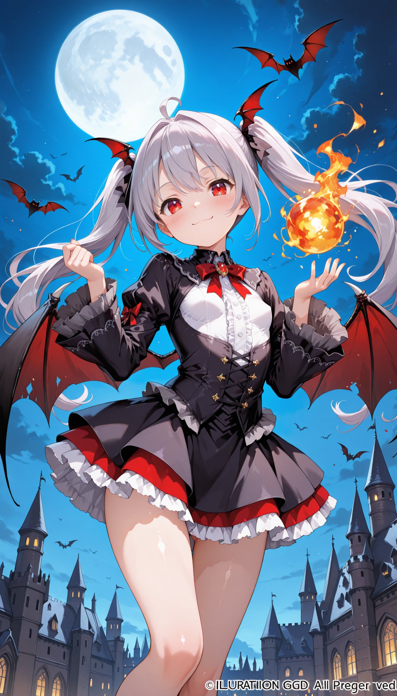masterpiece,high resolusion,illustration,ultra detailed 8k art,extremely detailed CG,official art,clothes reflecting light,detailed shiny skin,detailed background:1.3),1girl,little girl,Vampire girl,twintail,(6 years old),((loli:1.2)),kids,minimum body,smug smile,gothic lolita costume,sexy detailed mini skirt,gold accessory,shooting fireball,bouncing breasts,dynamic action,Dracula Castle,night moon,around flying bat