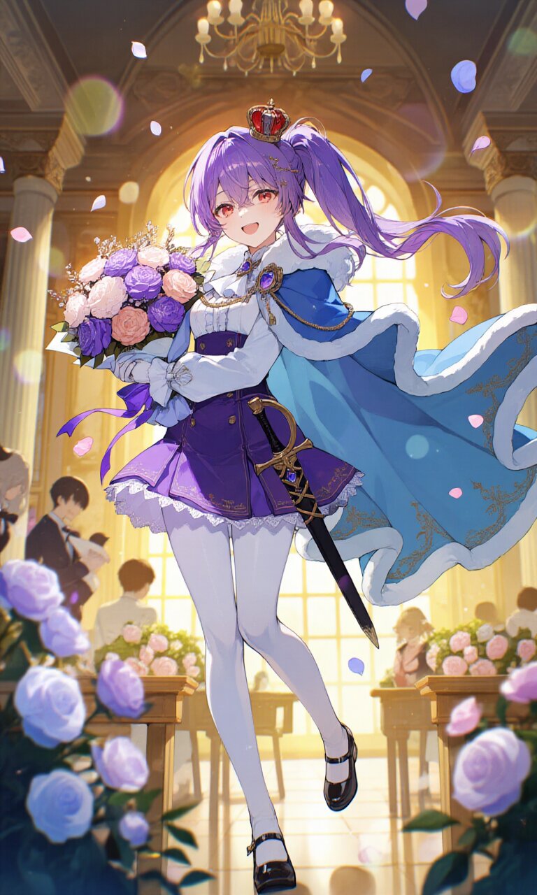 A 13-year-old girl with delicate features and a cheerful expression stands in a luxurious palace ballroom, dressed in an elegant purple prince costume with intricate details. She has long purple hair styled in a high ponytail with a decorative hair ornament, and her bright red eyes sparkle with happiness. Her outfit consists of a light blue, flowing cape with golden embroidery, a white frilled shirt with long sleeves, a purple mini skirt with lace trim, white tights, and polished black shoes with silver buckles. A jeweled dagger hangs at her waist, and a small golden crown rests atop her head. She holds a beautiful bouquet of flowers in her gloved hands while standing amidst blooming roses and peonies. The background features rococo-style architecture with gilded columns, chandeliers, and large arched windows letting in soft golden light with lens flare effects. Friends surround her in elegant attire, celebrating her birthday in this dreamy, romantic academia setting. The atmosphere is warm and joyful, with floating flower petals and a sense of magical realism in the hyper-detailed scene.
