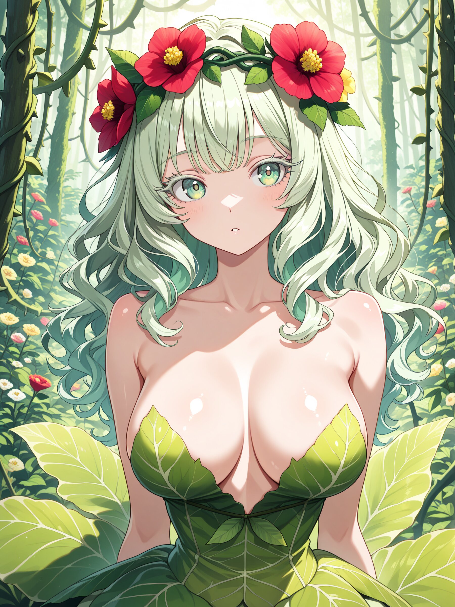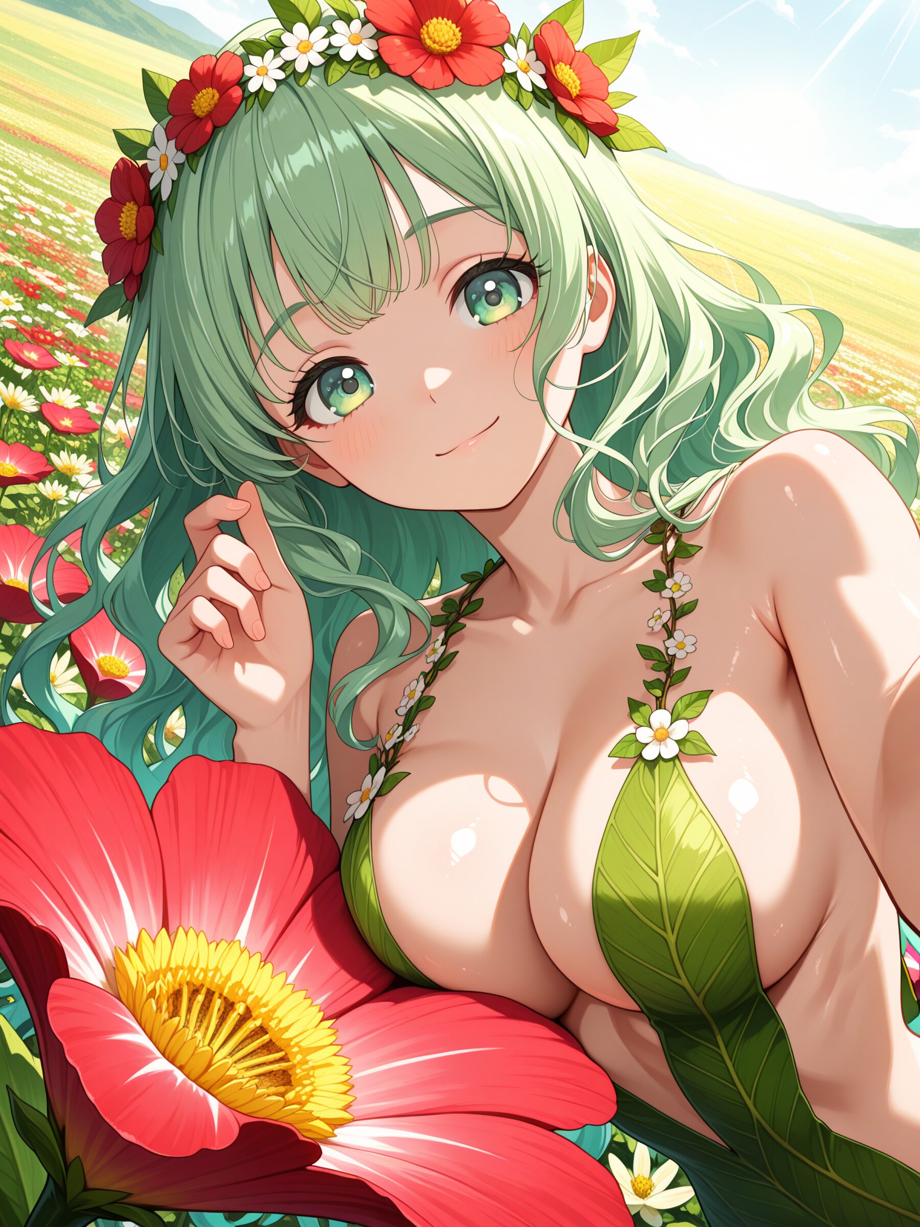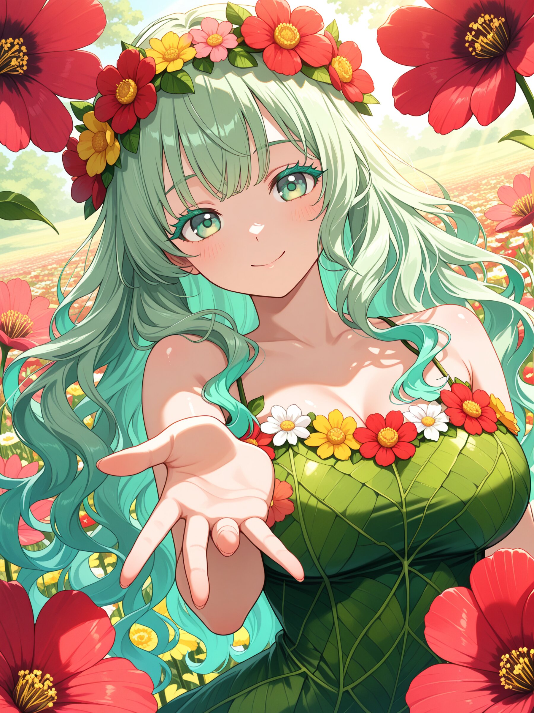 (masterpiece, best quality, ultra-detailed, intricate details, anime style, 8k illustration, vibrant colors), 1girl, (choppy bangs:1.2), ((green hair:1.2)), ((wavy hair:1.3)), medium length, soft hair, gentle face, kind smile, big breasts, light green eyelash, ((light green eyes)), round eyes, (droopy eyes:1.2), (gentle eyes:1.1), kind eyes, kind face, long eyelashes, slender, narrow waist, toned body, athletic, shiny skin, leaf dress, flower dress, large flower, ((Alraune:1.3)), red flower crown, (lower body in flower, girl in giant flower:1.3), flower field, colorful flowers, giant flower, reaching out hand, tender gesture, looking at viewer, admiring flower, warm sunlight, soft glow, ethereal atmosphere, upper body, close-up, diagonal angle, dynamic angle, fantasy, peaceful, serene, harmony with nature