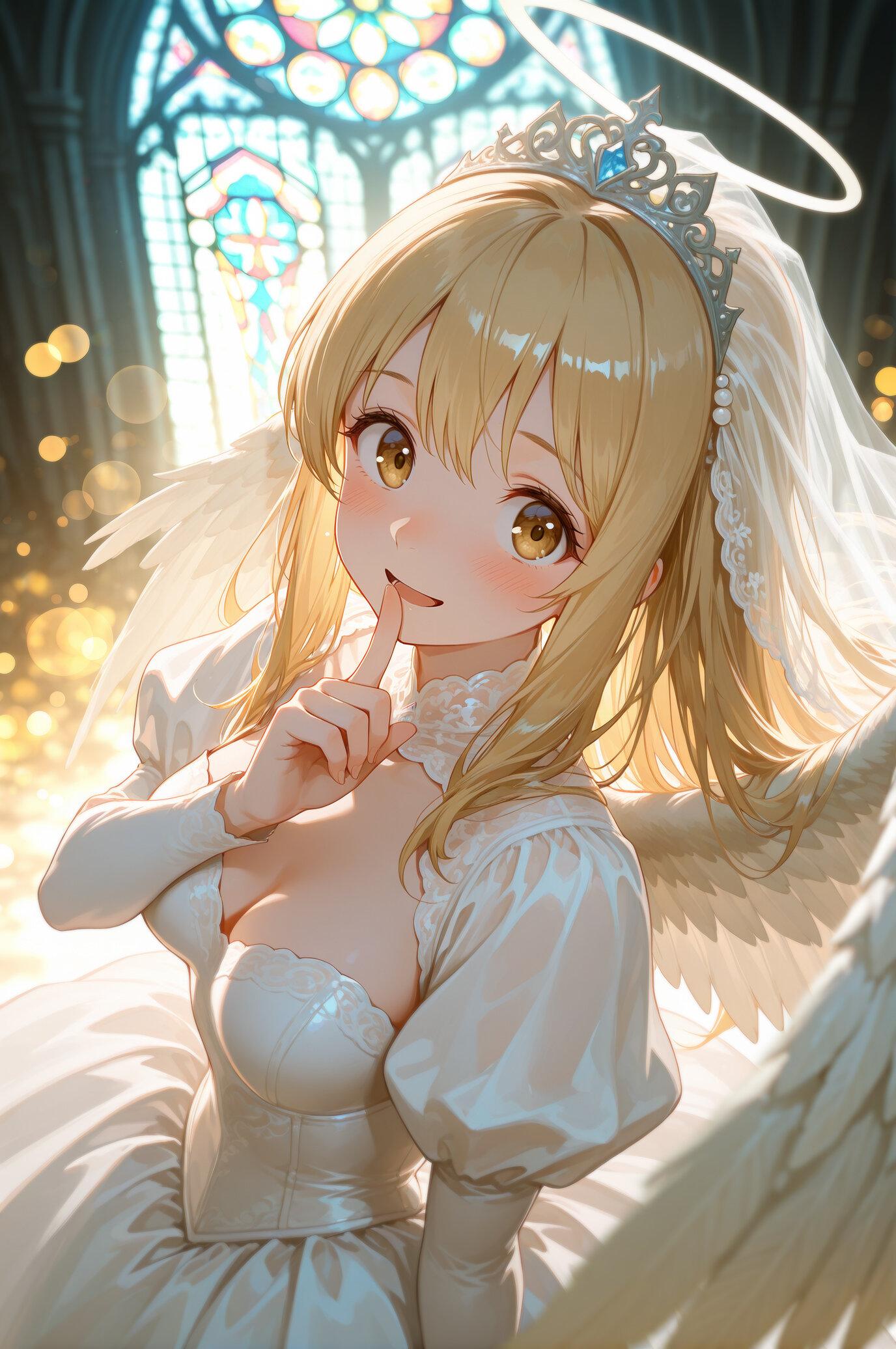 masterpiece, best quality, absurdres, 8k, ultra detailed, aesthetic, very aesthetic, newest, <lora:Fixhands_anime_bdsqlsz_V1:0.5>, <lora:bold-16oa:-0.5>, (realistic:0.3),BREAK (bokeh,shallow depth of field,Gaussian Blur:1.6),lens flare,1girl,A stunning bride wearing a luxurious white ball gown style wedding dress, princess silhouette, fitted bodice with a full voluminous skirt, richly decorated with ornate lace, pearls and jewels, standing gracefully in front of a grand church stained glass window. The scene is illuminated with dramatic, fantasy-like lighting, ethereal and majestic atmosphere, highly detailed, elegant, cinematic, fantasy art,(smile,shame,tareme:1.3),(finger to mouth:1.3),blush,blonde hair, long hair, brown eyes, (white angel wings:1.2),tiara,french bride,from above, ,open mouth,(upper body,wide angle,wide shot,face focus:1.3),(medium breasts,curvy:1.3),<lora:USNR STYLE_XL_loha:0.8>