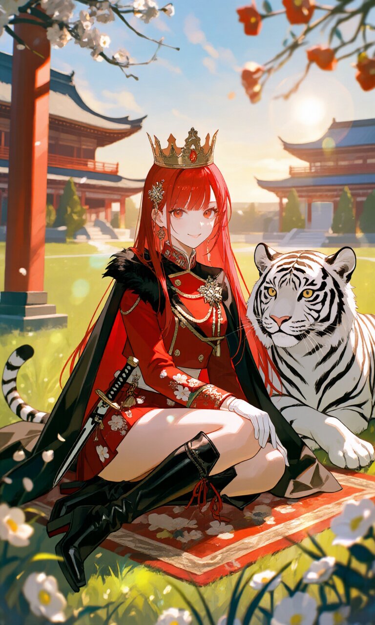 A stunningly photorealistic portrait of a beautiful young woman with vibrant red eyes and long, straight crimson hair flowing elegantly down her back. She wears an exquisite Japanese flower-patterned red prince costume with long sleeves, paired with a black cape that billows dramatically. A delicate crown rests atop her head, complementing the intricate Japanese hair ornament in her locks. Her outfit includes a mini skirt, black luxurious boots, and pristine white gloves, with a dagger elegantly sheathed at her waist. The princess sits gracefully on an ornate Japanese-patterned carpet in a palace garden, knees drawn up with one arm resting casually upon them. Beside her lounges a majestic white tiger, its fur glowing in the afternoon sunlight. The scene is bathed in warm golden light with soft lens flares and sunbeams filtering through the trees, creating a romantic academic atmosphere. Her delicate face features flawless, porcelain-like skin with a gentle smile as she gazes directly at the viewer with an expression of quiet confidence and charm. The background shows lush grasslands stretching toward an elaborate Japanese palace under a sky of perfect blue, with scattered cherry blossom petals floating in the air. Every detail from the embroidery on her costume to the individual strands of hair is rendered with breathtaking 8K clarity.