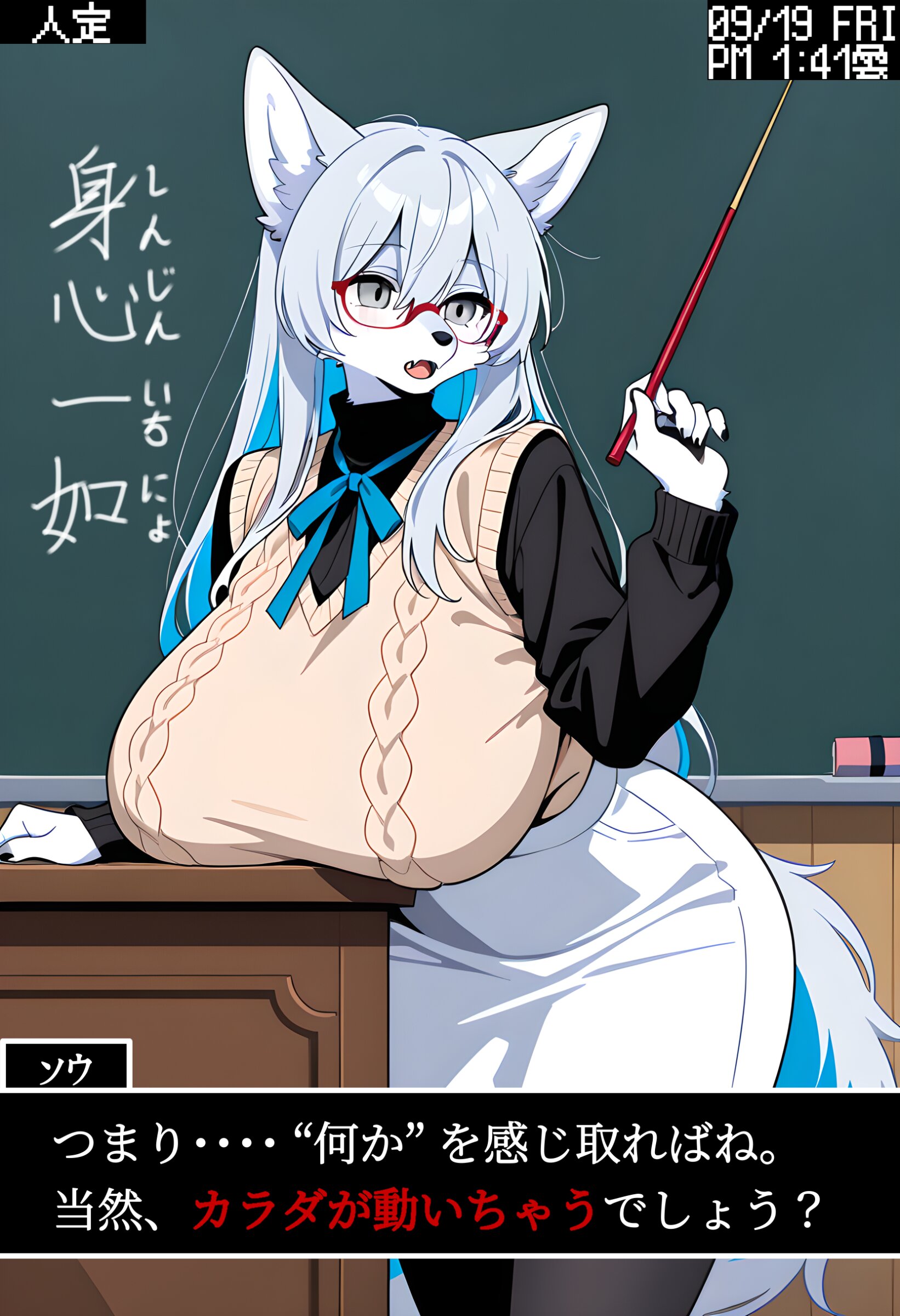1girl,(wolf girl),(furry female),(snout:1.3),blue fur,wolf ears,ears down,wolf tail,body fur,paw pads,(gigantic breasts),sagging breasts,narrow waist,wide hips,silver hair,hime-cut,long hair,colored inner hair,hair over eyes,silver eyes,hair between eyes,long bangs,red framed glasses,high collar,black collar,blue neck ribbon with loose ends,revealing clothes,undersized clothes,layering,separated turtleneck and sweater vest,v-neck beige sweater,aran sweater,black turtleneck under sweater,long sleeves,white pencil skirt,black pantyhose,expressionless,unemotional,open mouth,fangs,standing,holding a pointer stick,the pointer on the blackboard,hand on lectern,a textbook on lectern,school,blackboard,from front,three-quarter view,shaded body,looking ahead,hair shade,((high contrast)),(digital art:1.1),(anime coloring),(kawaii),softy,(2D),(cute),furry,(two tone fur),(furry body),perfect body,detailed face,high quality,cute clothes,animal tail,animal ears,solo,masterpiece,((correct_anatomy)),gddw,pretty and cute, masterpiece, comical, simple, anime,flat color, no lineart,Bright colors, Contour line, pale painting, <lora:flat1:0.7> <lora:yawanuri:0.7>