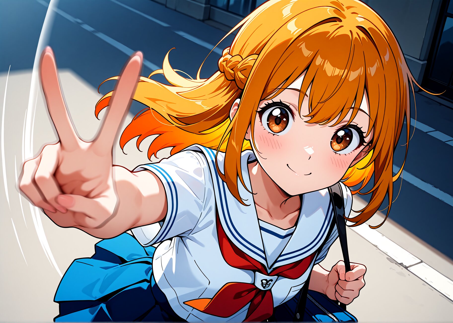 eye focus,upper body,running,masterpiece, best quality, amazing quality, very aesthetic, absurdres, newest,illustration,cute,simple background, direct light ,delicate anime-style illustration,cute, outdoors school, dynamic pose, foreshortening, extreme perspective,see-through silhouette,(motion blur on background:2.0), 1girl,13 years old,squared face,puffy face,straight hair,choppy bangs,long brown hair with( orange highlights:1.2),french braid, round eyes,brown eyes, school uniform,making a peace sign, smile, holding school shoulder bag,wind,looking at viewer, <lora:DynamicPoseIL2att_alpha1.0_rank4_noxattn_900steps:0.8>,