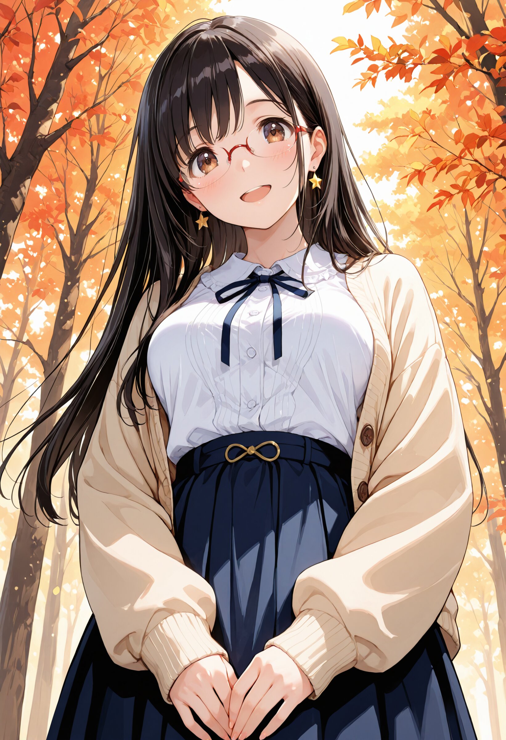 1girl, 17 years old, 155cm tall, brown eyes are shining and cute, black hair, long hair, extremely detailed neat hair,Straight hair, tareme, ((red semi-rimless eyewear:1.2)), star earrings, medium breasts, smile, blushful, happy, compassion, warm autumn light, exquisite fingers:1.3, serene forest background, beautiful, young girl, lovely, round face, luscious, bright, sweet, half-open mouth, adorable, cute, endearing, tender, (Cute blouse with a delicate drawstring design, soft cardigan, corduroy skirt, all in soft, pastel, from below, masterpiece, best quality, ultra-detailed, 4k, 8k, finely detailed, highres, anime, intricate, soft lighting, sharp focus, beautiful, detailed clear line art, detailed background,