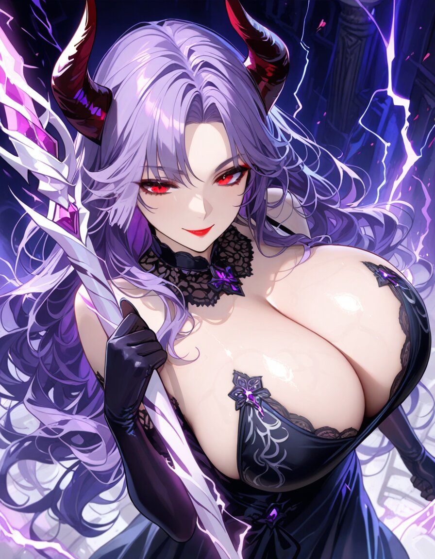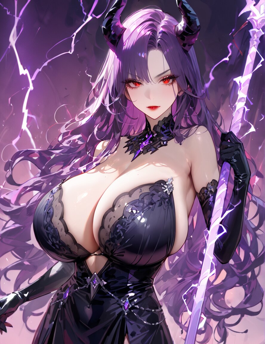 high quality, detailed, perfect hands, perfect fingers, masterpiece, mature woman, the thirties, Devil horns, parted bangs, detailed hair, purple hair, long hair, wavy hair, detailed eyes, red eyes, detailed skin, makeup, red lips, smile, closed mouth, huge boobs, Huge breasts, elbow_gloves, black dress, purple lace decoration dress, strap_less dress, detached collar, Gothic print decoration, gorgeous decoration, glowing polearm, glowing spear, gripping object, holding polearm, purple lightning, lightning, purple aura, upper body, sunlight, *1.HassakuXLを使用しています。加筆修正をしている為、そのまま入力しても出力されない可能性があります。*2.SwordMakerを使用しております。