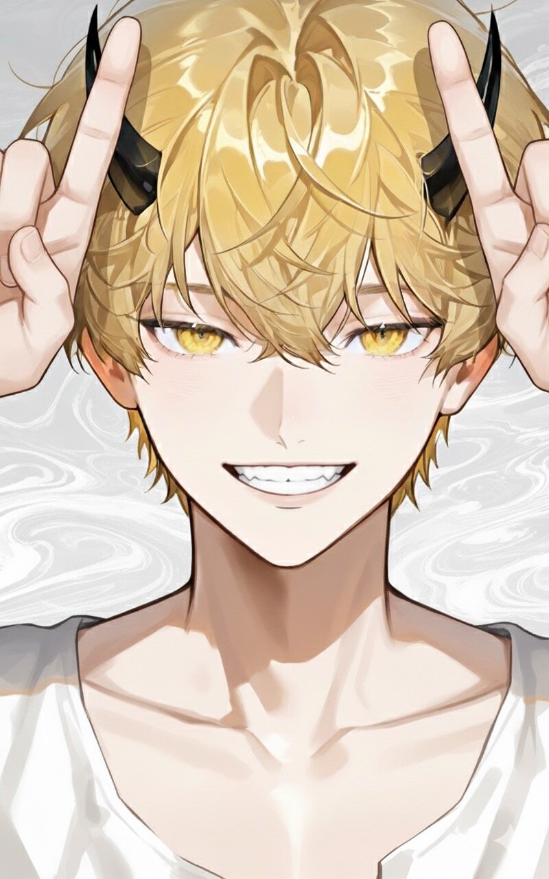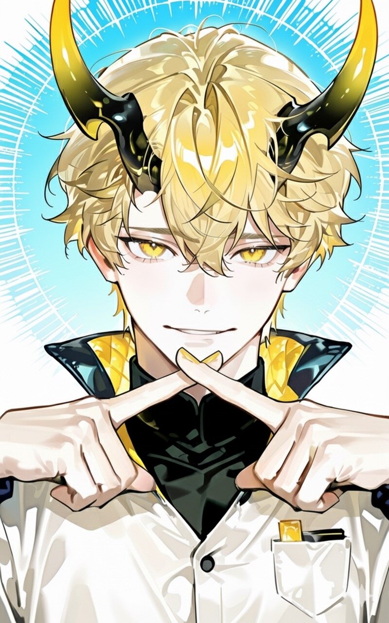 1 male, solo, blonde hair, short hair, hair between eyes, yellow eyes, small horns on head, doing horns pose with fingers, detailed hands, upper body shot, fantasy style, highly detailed, sharp focus, plain background, smiling shyly, bashful expression, blushing cheeks,muksal style,detailed background, detailed clothes, (masterpiece:1.2), (best quality:1.2), (very aesthetic:1.2), (absurdres:1.2), newest, ,