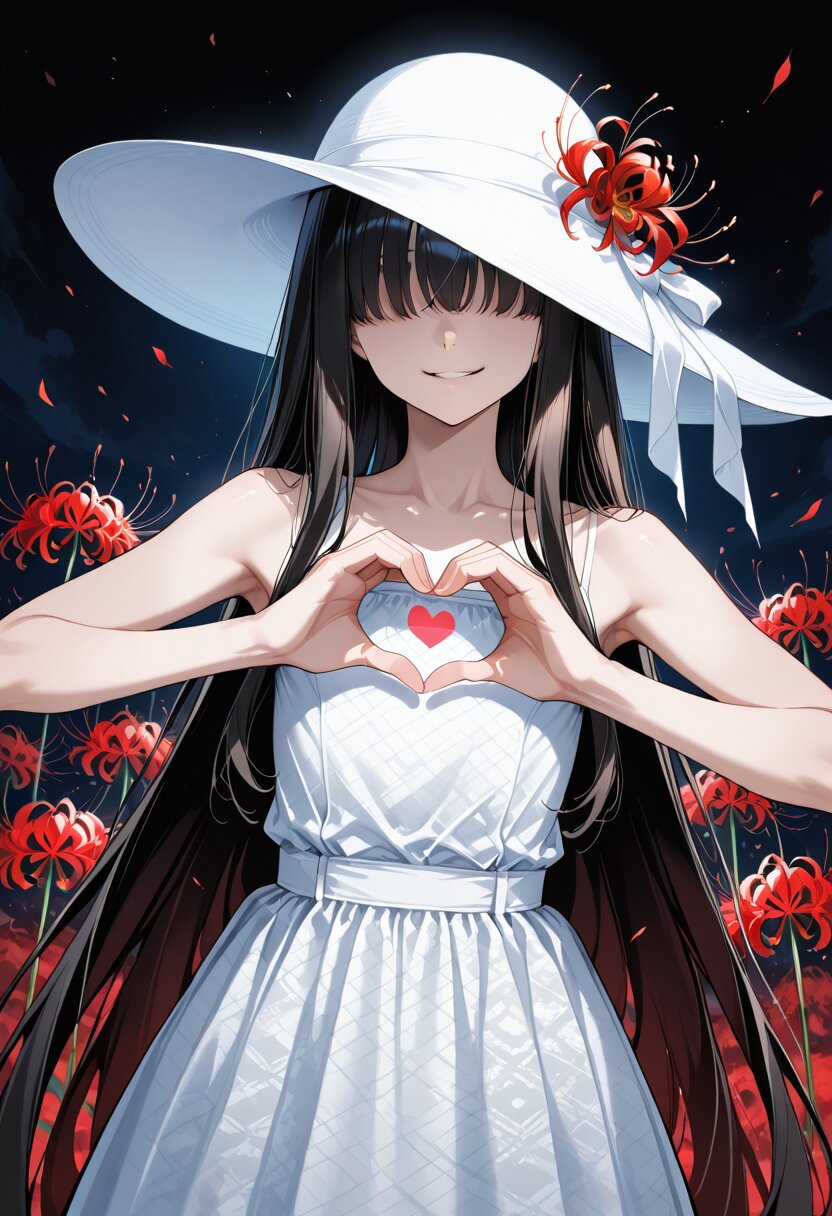 (rating: sensitive:1.2), score_9, score_8_up, score_7_up, score_6_up, NSFW, source_anime, 1girl, hasshaku-sama, tall, (heart hands on one side of breast, 4-finger heart hands), upper body, black straight hair, very long hair, (bangs over eyes), white summer dress, wide brimmed white hat, smirk, from below, diagonal view. lycoris radiata, red spider lily, (fashion illustration, horror, ultra-intricate detailed), flat design, bold colors, patterned fabric, beautiful composition, in the style of cute anime girl. BREAK insanely beautiful and detailed clothes, extremely shiny hair, beautiful small face, kawaii, cute, flat chest, slender, exquisitely delicate pale skin, perfect anatomy, dynamic angle, dynamic pose, BREAK (masterpiece, aesthetic quality, 8K, ultra-detailed), (perfect design, realistic complex), absurdres, highres, hyperrealistic, photorealistic, cinematic lighting,