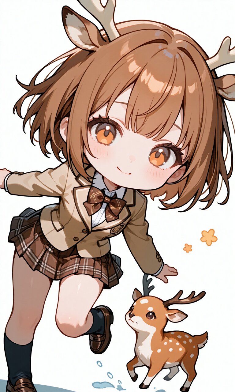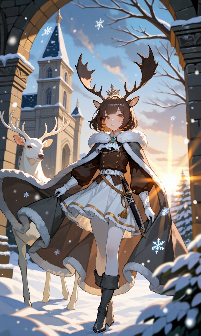 A young girl with delicate features and a cheerful expression walks gracefully through a Nordic palace courtyard in the afternoon. She has small antlers and deer ears peeking through her bob-cut brown hair, with warm amber eyes that sparkle with intelligence. Her Prince Charming-inspired outfit consists of a brown princely costume with long sleeves, a fluffy dark gray cape flowing dramatically in the winter wind, and a luxurious white mini skirt over white tights. She wears dark gray elegant boots and white gloves, with a dagger at her waist and a delicate crown atop her head. The flat-chested girl smiles gently as snowflakes swirl around her, accompanied by a majestic white deer. The romantic academia atmosphere is enhanced by soft lighting with lens flares from the low winter sun, casting golden hues across the snowy landscape. The palace's intricate stonework appears in the background, with leafless trees swaying in the breeze. Every detail from the embroidery on her costume to individual snowflakes is rendered with insanely detailed precision, creating a dreamy, storybook quality.