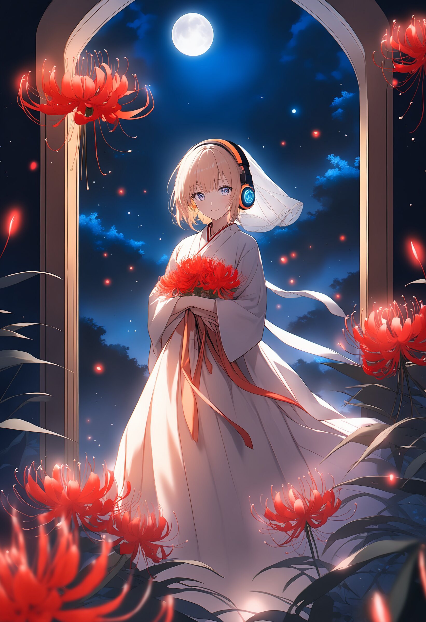 Anime-style illustration, professional photographer’s perspective. (Japanese idol Zena:1.3), (orange bob haircut:1.4, softly glowing in moonlight), (pastel orange headphones:1.2 with delicate shine). She wears an elegant flowing dress:1.4 inspired by traditional Japanese style, accented with sheer fabrics and soft lace, gently swaying in the night breeze. (Pose: standing gracefully in a field of glowing red spider lilies:1.5, hands gently holding one flower as if cherishing its fragility). (Expression: serene and kind smile:1.4, eyes radiating warmth and compassion, gaze softly meeting the camera). Lighting: (silver moonlight:1.5) cascading down, wrapping Zena in a gentle glow, highlighting the vibrant contrast between her soft elegance and the deep crimson spider lilies. (Background: a vast field of red spider lilies under a large glowing full moon, subtle mist adding mystery, fireflies glimmering faintly). Composition: (full-body shot, leading lines of spider lilies guiding the viewer’s eye to Zena). Lens: 85mm portrait lens, shallow depth of field, focus sharp on Zena, bokeh effect softening the background moon and flowers. Atmosphere: (ethereal, graceful, spiritual — beauty and kindness harmonized within the quiet night). ✨ Keywords: “Zena, red spider lilies, full moon, kindness, elegance, spiritual beauty, Japanese aesthetic, serene night, realistic photography, anime-style.”