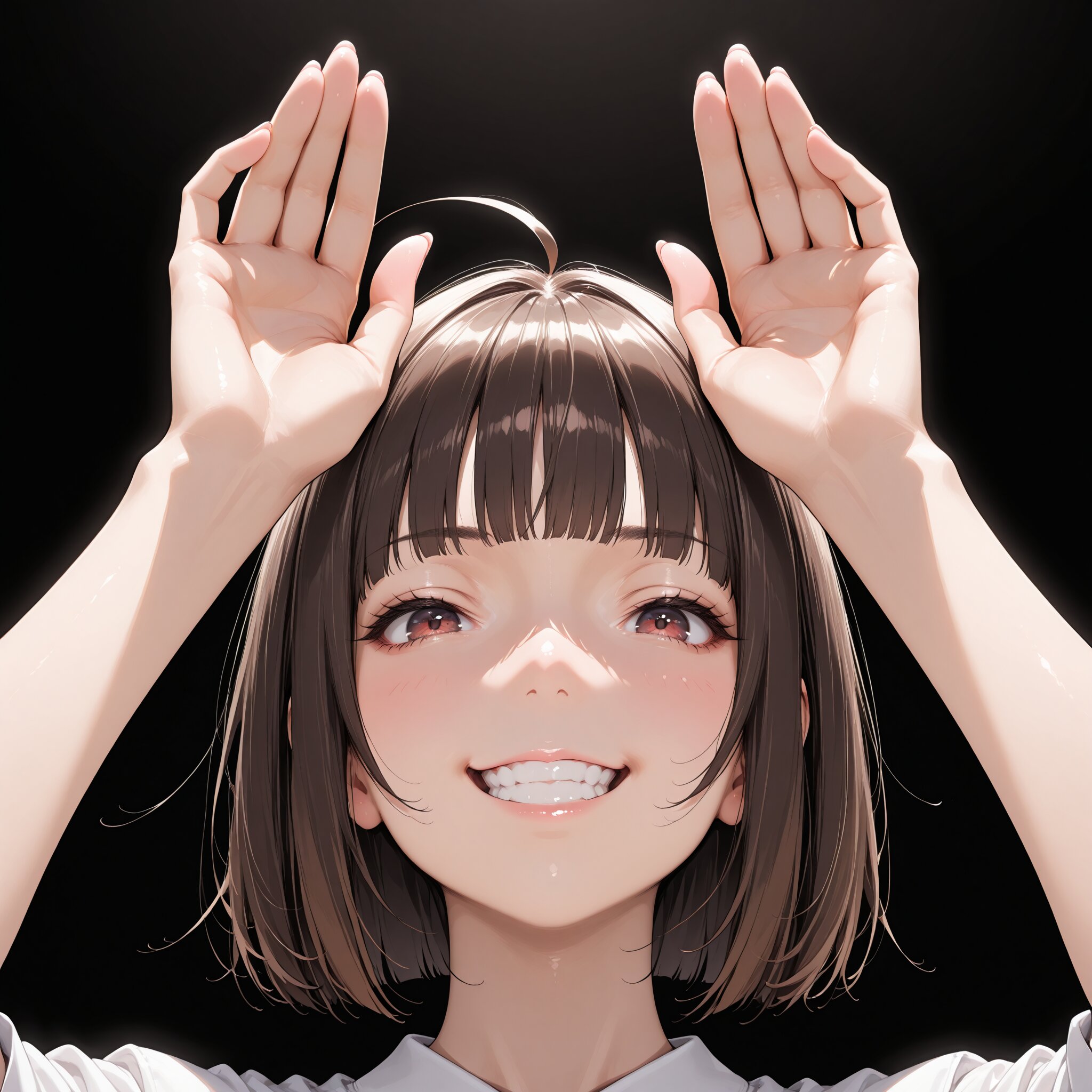 brown hair,1girl,solo,ahoge,blunt bangs,short hair,straight hair,hime cut,delicate face,detailed face,detailed skin,masterpiece,best quality,insanely detailed,beautiful,8k,photorealistic,Mocking laugh,clenched teeth,evil,smug face,condescending expression,cheerful,looking at viewer,flat background,light atmosphere,from below,rabbit pose