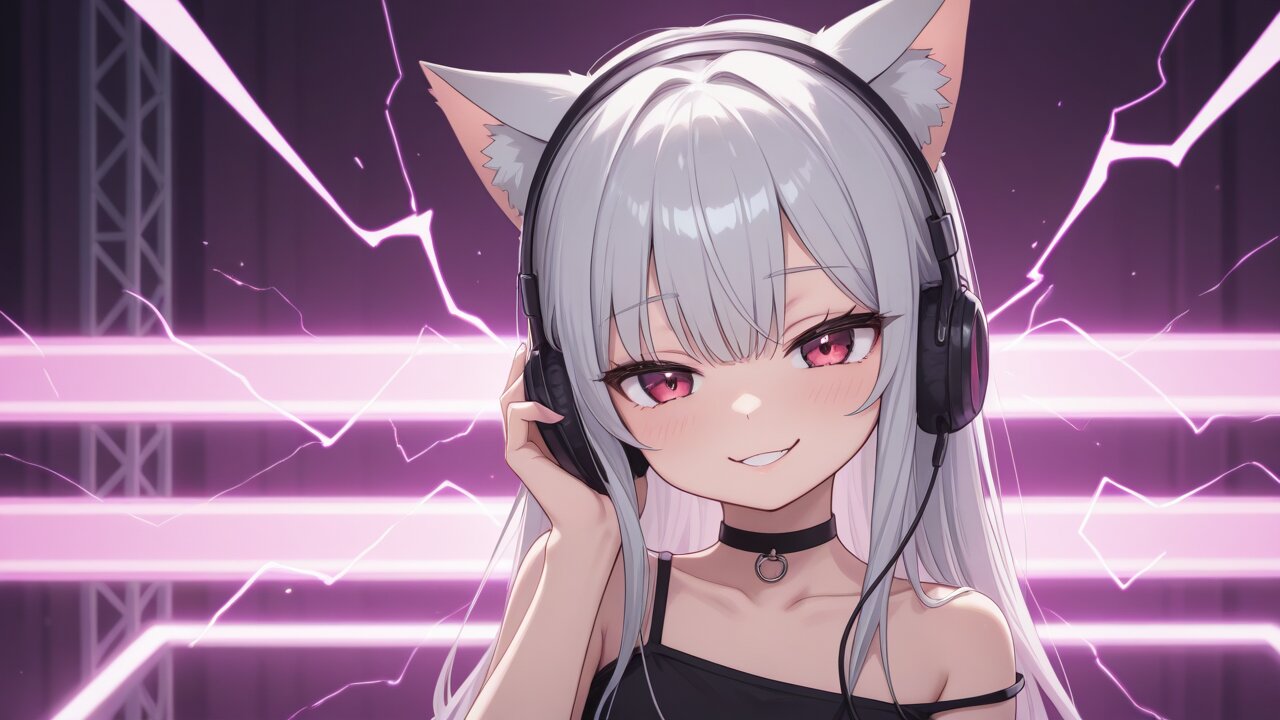 (masterpiece, 32k,focus sharp,extreme detailed,top quality, best quality, beautiful and aesthetic:1.2), extremely detailed face, perfect lighting, 1girl,solo,24yo, Mesugaki,smug, bare arms,bare shoulder,collarbone,choker, raise a hand, <lora:DJILL:0.3>, electricity,electronic music, at the night club, (headphone,cat ears,silver hair,long hair,cat eyes,Red-purple eyes:1.2), upper body