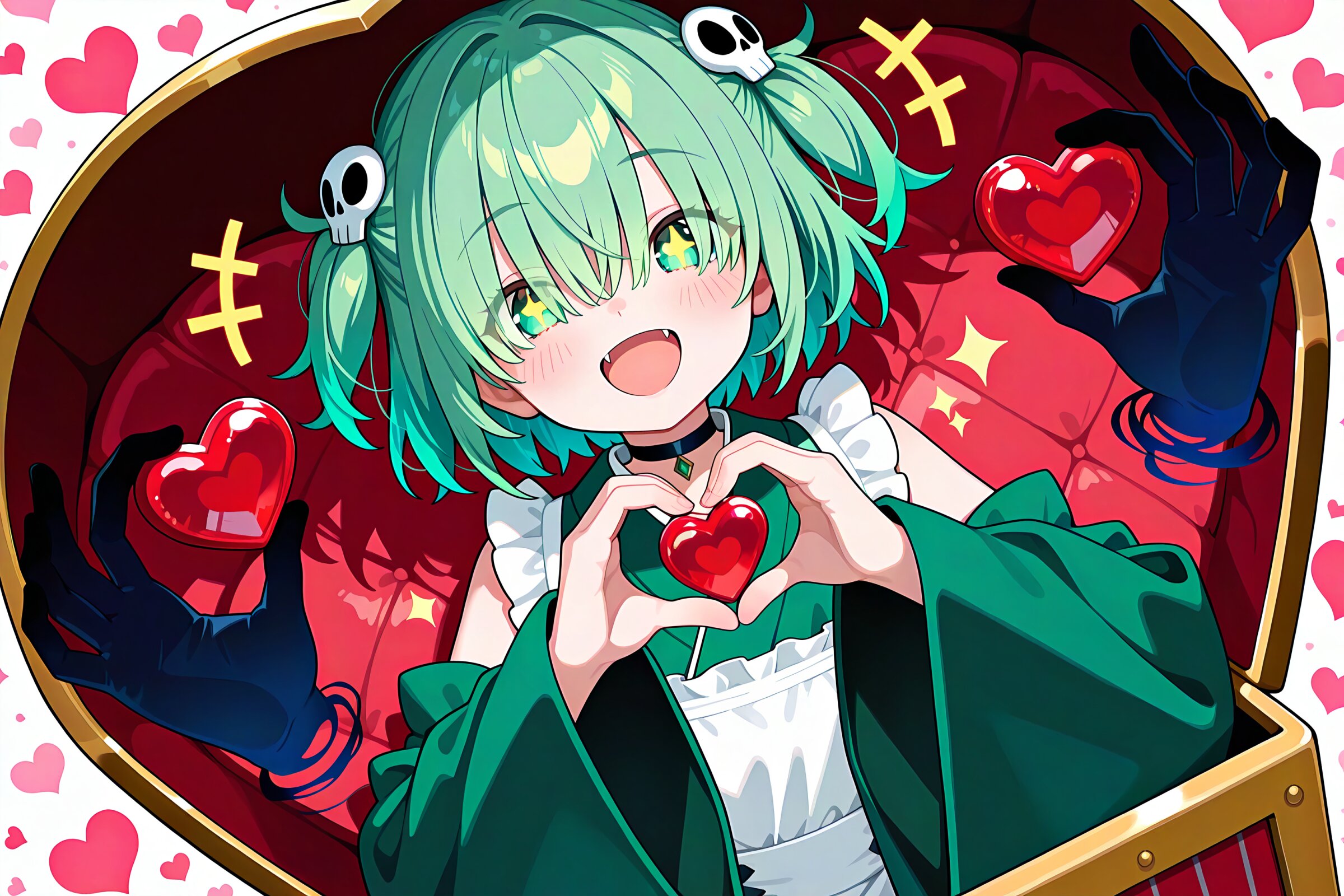 1 little girl, solo, diagonal angle, masterpiece, best quality, amazing quality, very aesthetic, cobalt green hair, short hair, messy hair, (hair over eyes:1.2), green eyes, demon fangs, +_+, open mouth, smile, cheerful, +++, notice lines, choker, green wa maid outfit, (oversized sleeves:1.2), detached sleeves, (floating black ghosty hands:1.2), skull hair ornament, in mimic heart-shaped box, heart hands, holding heart-shaped lollipop, heart background,