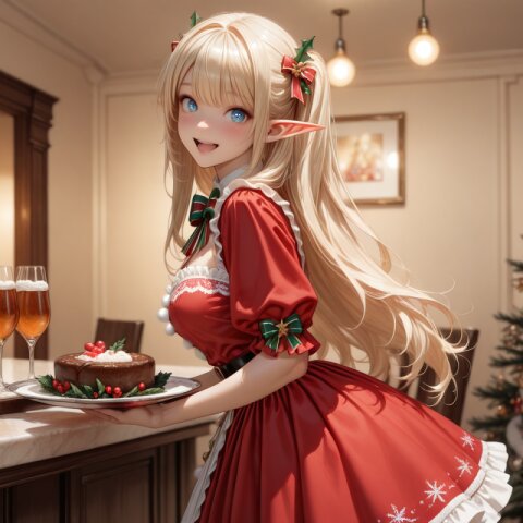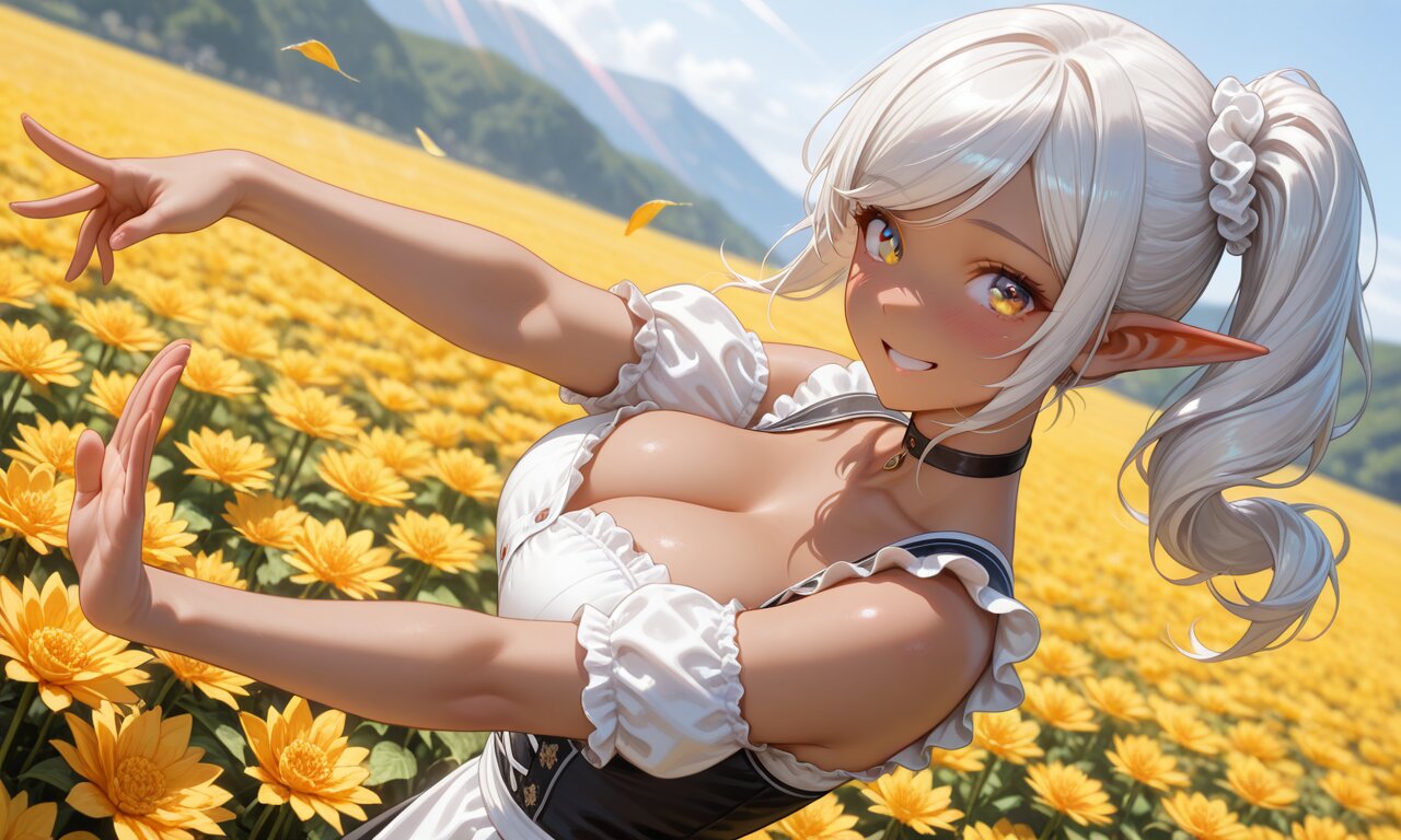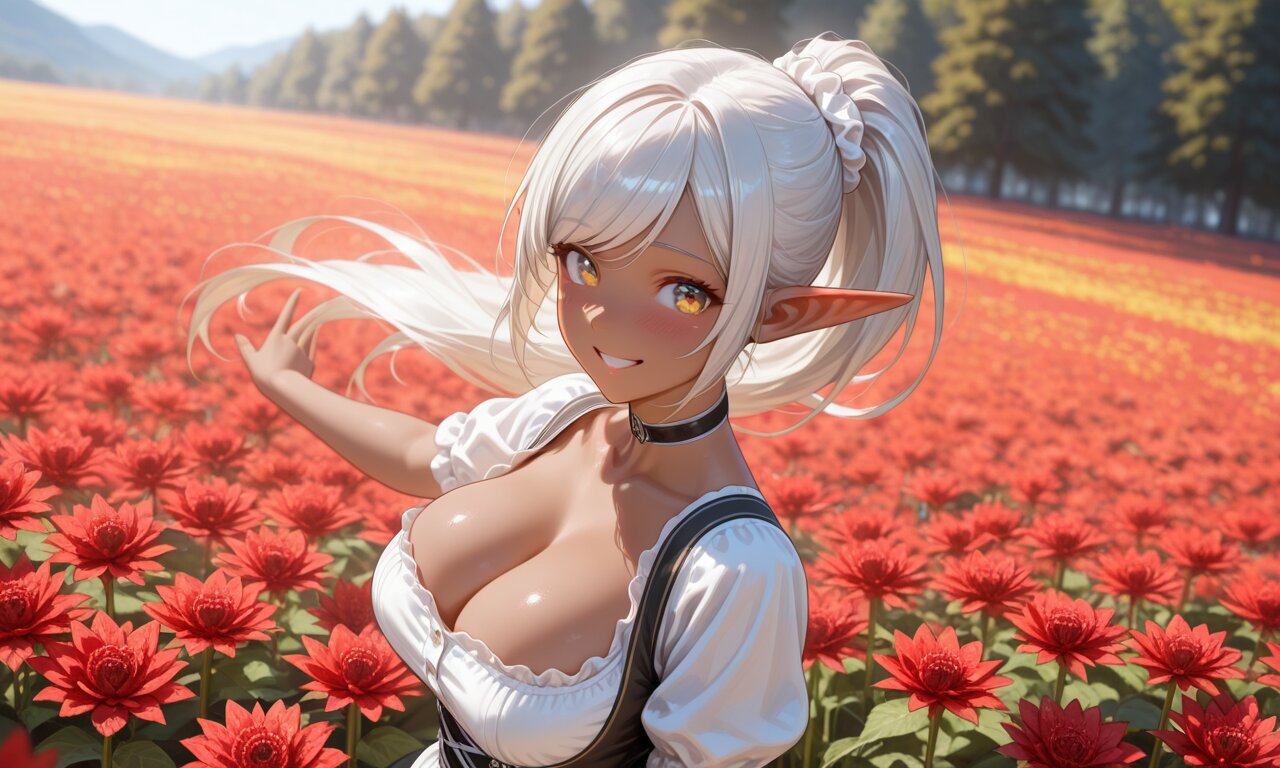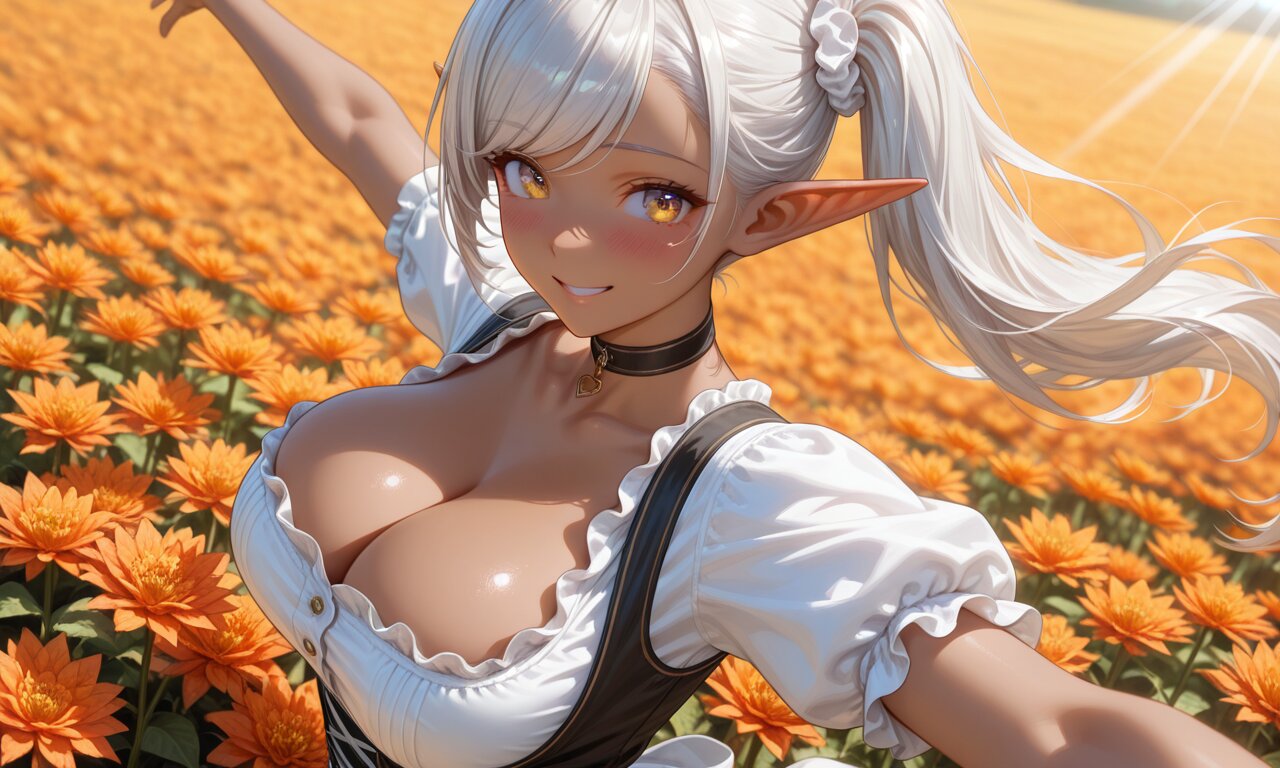 sfw:1.2, swept bangs, white scrunchie, collarbone, frills, german clothes, dirndl, choker, ear scrunchie, scrunchie, moe heroine, nice hands, perfect hands, perfect anatomy, perfect structure, background is autumn season, dahlia, A colorful flower field stretches out to the horizon, sunlight, (On a Morning, the girl dancing pose, gaze at viewer with an Embarrassed happy smile face), outdoors, 1girl, solo, upper body shot, high angle, from side, close-up, face focus, Hair and clothes fluttering in the wind, ultra detailed lips, ultra detailed face and hair, beautiful eyes, kawaii, adorable, cute, dark elf girl, golden eyes, Moist eyes, (dark skin:1.4), dark-skinned female:1.4, (shine silver hair:1.3), large breasts, wide hip, volumetric lighting <lora:elf-san alpha1:0.3> <lora:elf-san_alpha4(IL1.0):0.4>, anime style, anime color,, masterpiece, amazing quality, very aesthetic, high resolution, ultra-detailed, absolute, newest, 2d, semi-realistic, moe heroine, sharp focus,