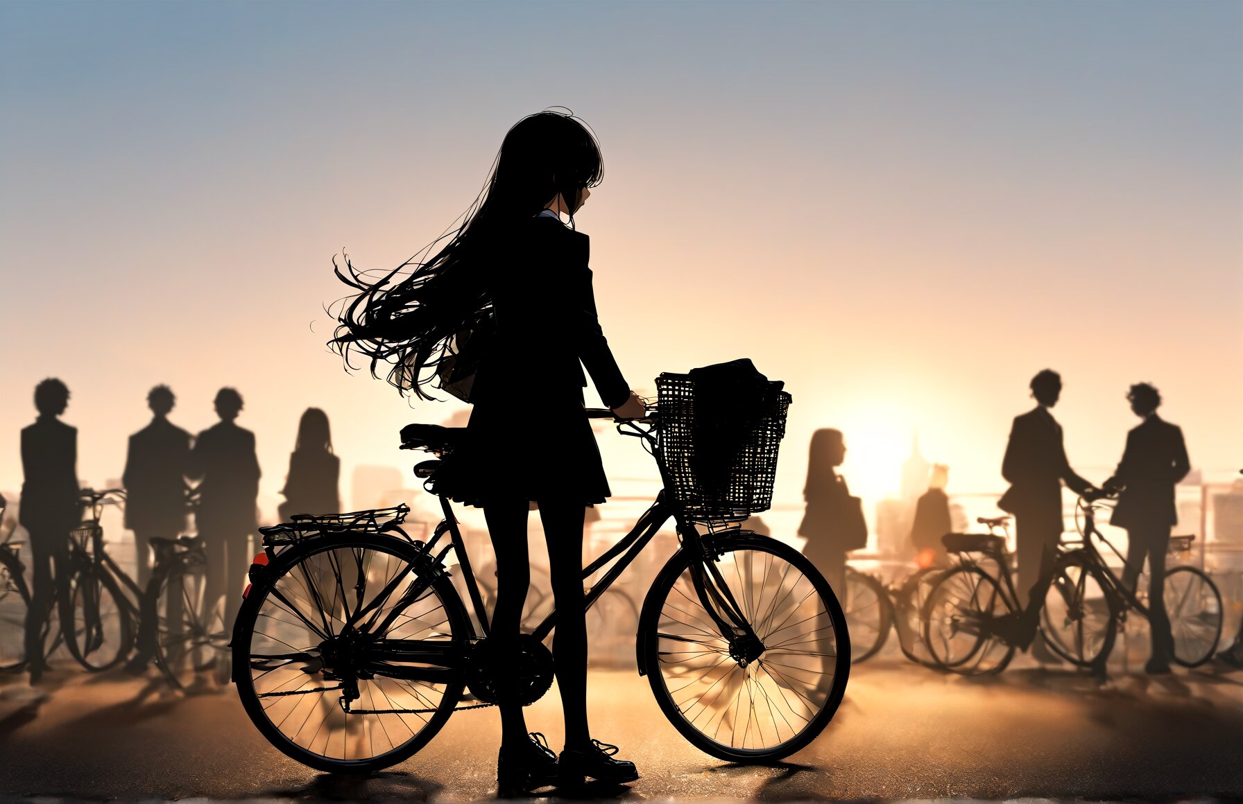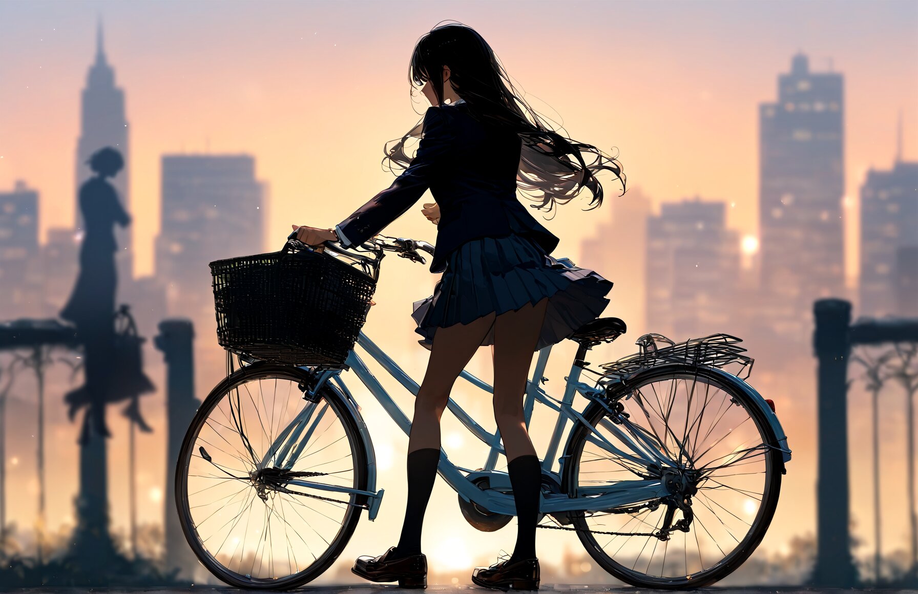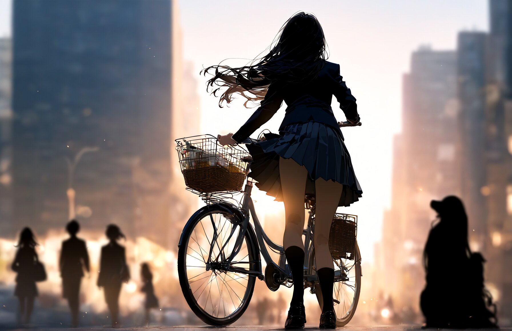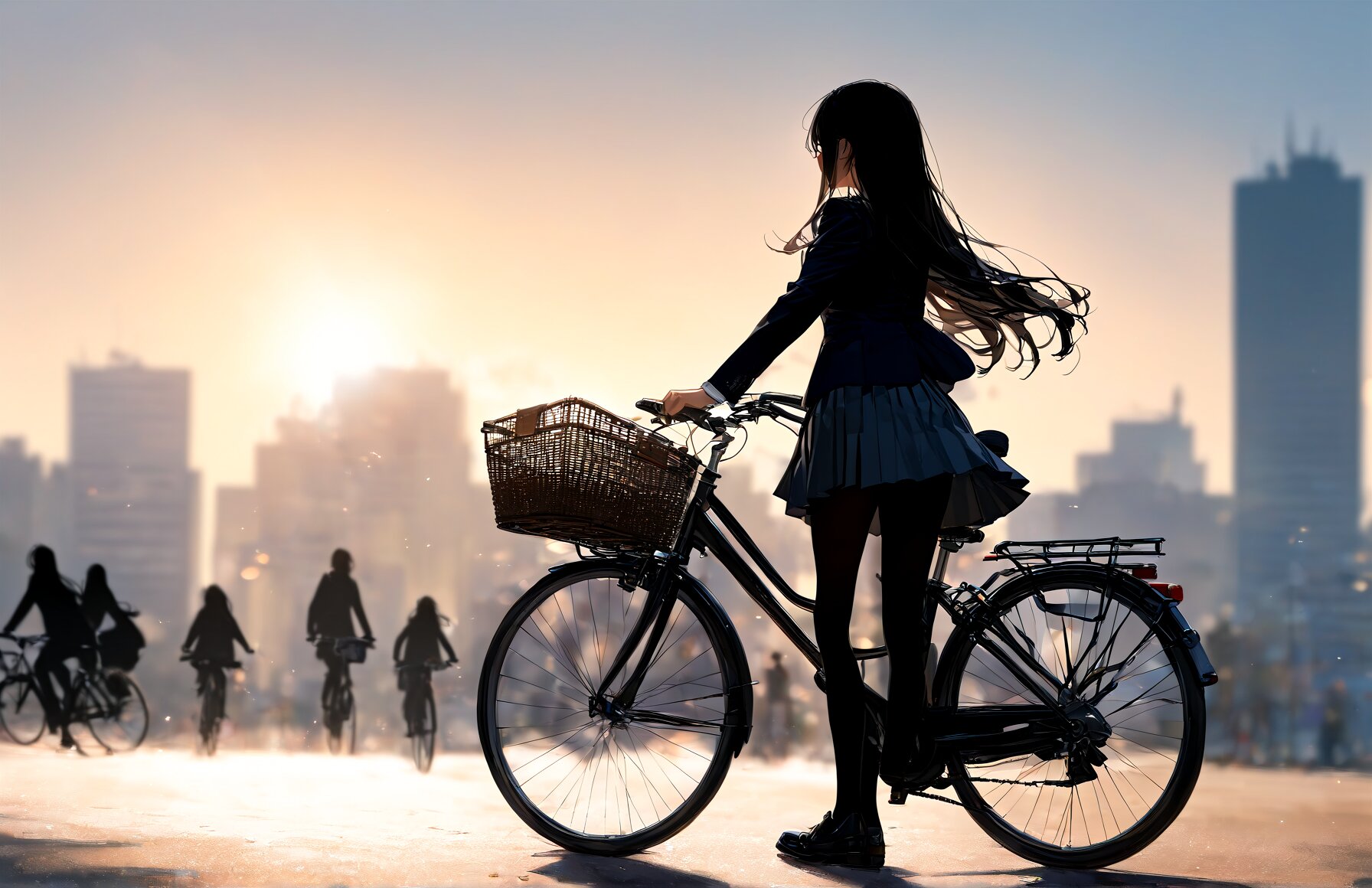 (((silhouette,)masterpiece, best quality, high quality, ultra high res, 8k, perfect anatomy:1.3,)) back lighting,city,suit,morning, <lora:bicycle_illustrious_V1.0:0.69> bicycle, 1girl, ground vehicle, skirt, riding, school uniform, bicycle basket, black legwear, underwear, pleated skirt, shoes, long hair, outdoors, basket, black hair, day, socks, blurry, depth of field