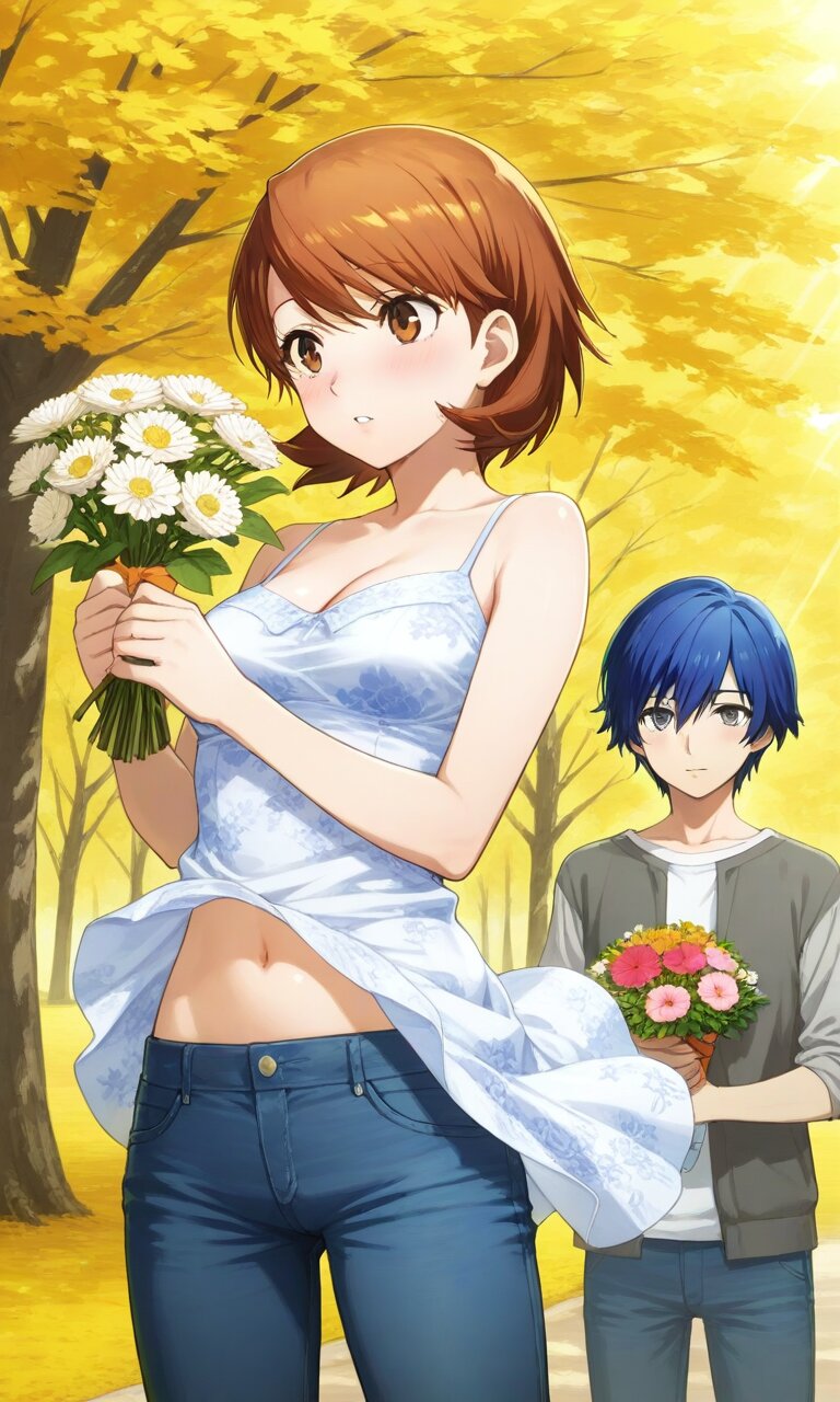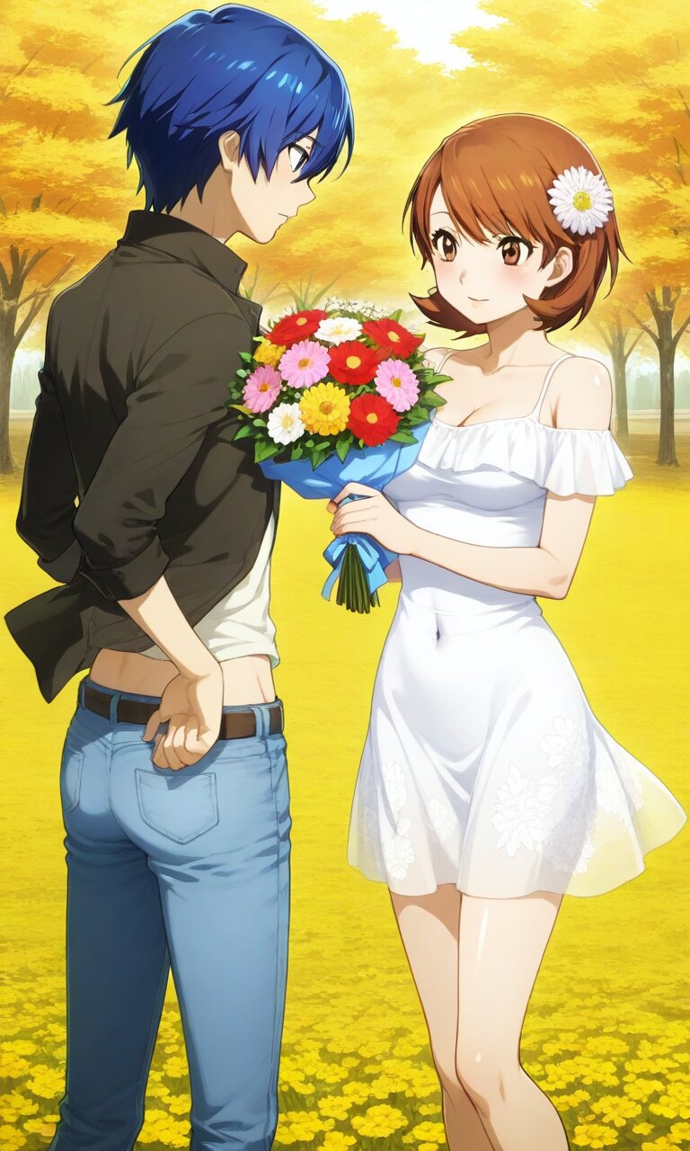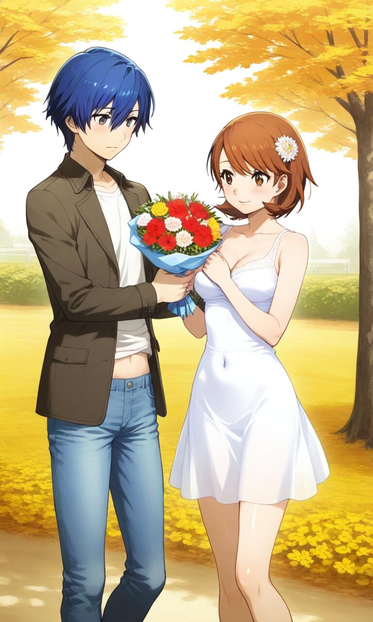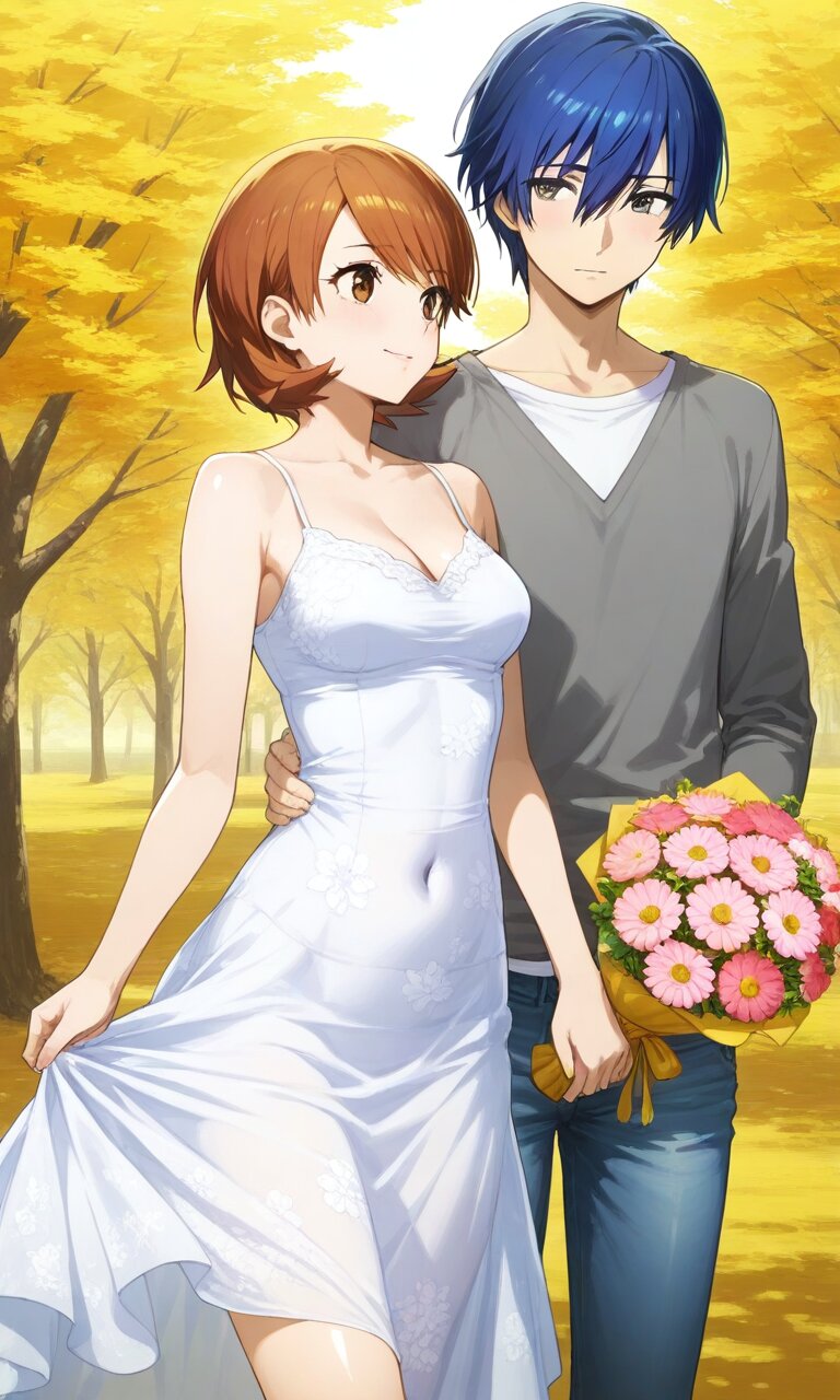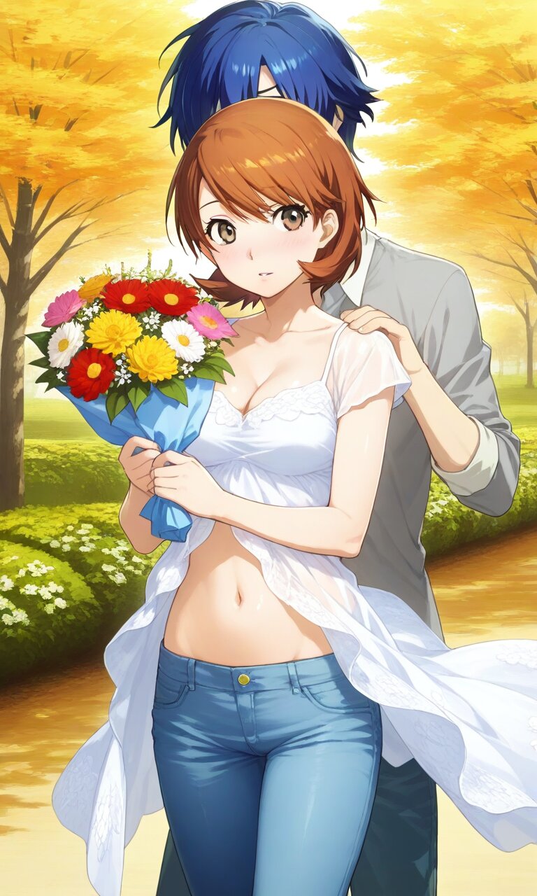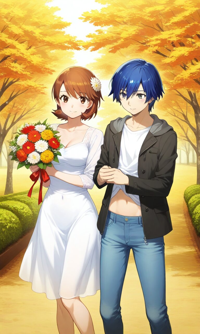 Couple, boy and girl, two people only,absurdres, ultra-detailed, master piece, high resolution, 8k, Boy, girl, couple, NSFW, masterpiece, best quality, extremely detailed, full color, beautiful detailed young woman, standing in autumn flower garden, wearing flowing dress with floral patterns, skirt , shiny skin warm under golden sunlight, hair adorned with chrysanthemum flowers, eyes sparkling with joy, young man, holding bouquet of cosmos flowers, jeans, surrounded by vibrant autumn blooms like dahlias and asters, crisp fall air, perfect anatomy, explicit autumn floral tease. BREAK the boy(yuuki makoto, blue hair, gray eyes, 1 boy , ) BREAK the girl(yukari takeba, short hair, light brown hair, brown eyes, large breaths,Cleavage, navel)