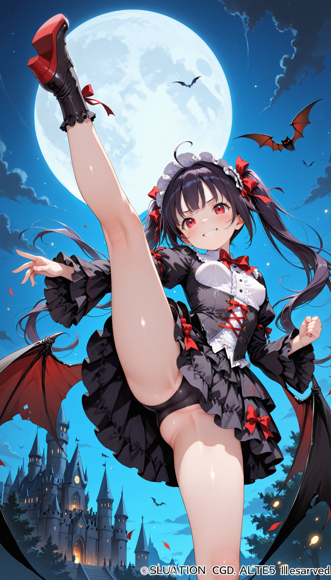 masterpiece,high resolusion,illustration,ultra detailed 8k art,extremely detailed CG,official art,clothes reflecting light,detailed shiny skin,detailed background:1.3),1girl,little girl,Vampire girl,twintail,(6 years old),((loli:1.2)),kids,minimum body,smug smile,gothic lolita costume,sexy detailed mini skirt,gold accessory,jummping kick,motion_line,(bouncing breasts),dynamic action,dynamic pose,monster battle,Dracula Castle,night moon,around flying bat
