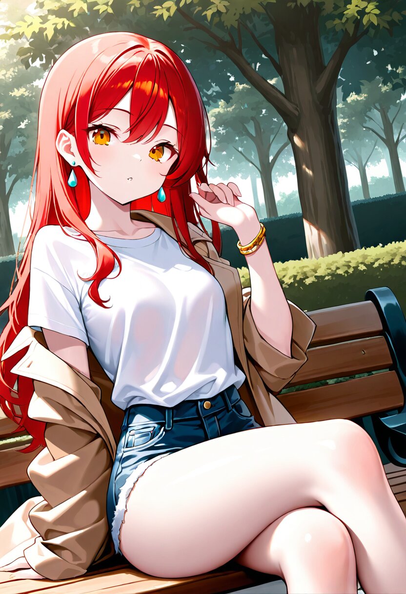 RAW photo, subject, 8k uhd, dslr, soft lighting, high quality, film grain, Fujifilm XT3, masterpiece, best quality, girl, (masterpiece),best quality,(perfectly anatomy),((kawaii:1.6)), ng_deepnegative_v1_75t,masterpiece, score_9, score_8_up, score_7_up, score_6_up, score_5_up, score_4_up, cartoon, ultra-detailed, (best quality:1.1), full character portrait, (girl, Japanese, young, petite, pale skin, breasts, red hair, long hair, amber eyes, earrings, sitting, outdoors, park, t-shirt, denim, trench coat, earrings(amethyst),bracelet(gold),sitting, crossed legs, a girl dressed all in white sits on a bench on the park, jewelry, crossed legs, looking at viewer, ) <lora:WasurePony:1> <lora:Age Slider_alpha1.0_rank4_noxattn_last:1>