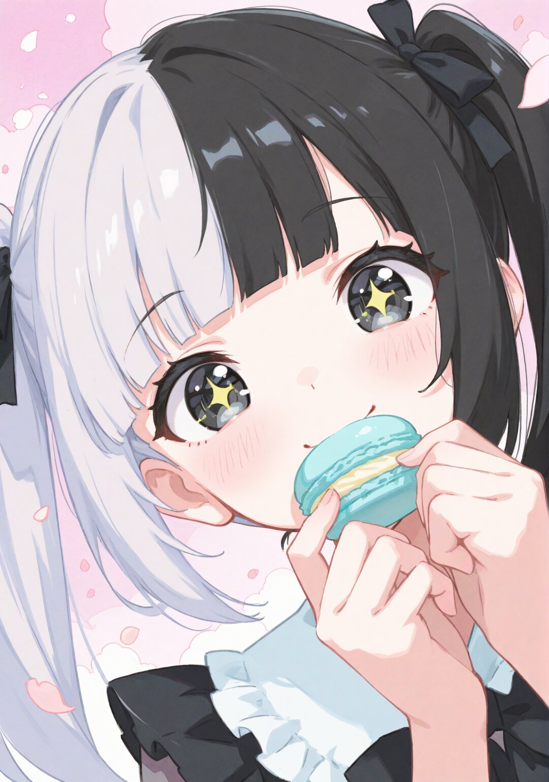 1girl, solo, blunt bangs, twintail, black eyes, (((split-color hair))) (((two-tone hair))), (black hair), (silver hair), jirai kei,, masterpiece、best quality、amazing quality, solo, kawaii, cute, dynamic pose, dynamic angle, looking at viewer, (soft pastel color palette1.5), (pale colors:1.3), watercolor texture, matte finish, subtle shading, minimal contrast,, eating macaron, holding it close to her mouth, sparkling eyes, soft blush, cute smile, zoomed-in portrait, delicate fingers holding the macaron, dreamy pastel background,, pastel color palette, soft glow, sparkles, floating petals, fluffy textures, star motifs, heart motifs, translucent fabric, soft frills, magical atmosphere, gentle light, dreamy background, faint clouds, cute accessories, subtle rainbow tones