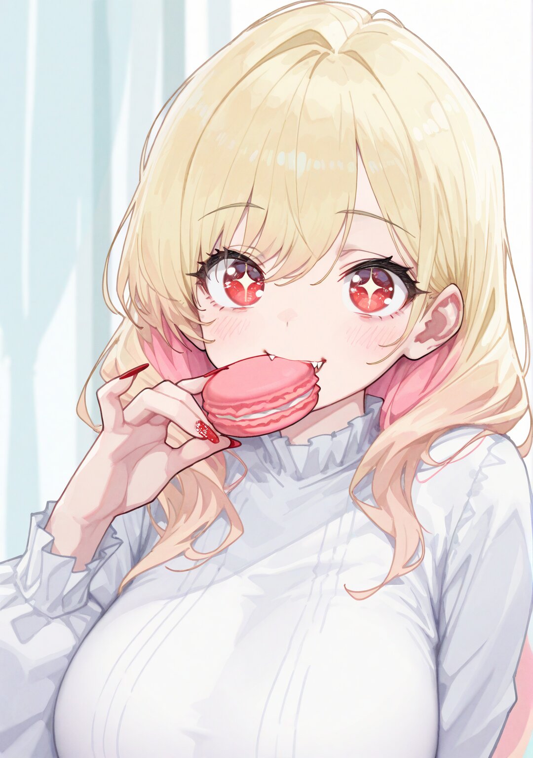 Blonde long hair, pink inner hair, blonde to pink gradient hair, bangs, red eyes, upturned eyes, ample bust, pink inner hair, blonde to pink gradient hair, fangs, long nails, red nail polish, gorgeous nail art, Stylish attire,Mature woman,, masterpiece、best quality、amazing quality, solo, kawaii, cute, dynamic pose, dynamic angle, looking at viewer, (soft pastel color palette1.5), (pale colors:1.3), watercolor texture, matte finish, subtle shading, minimal contrast,, eating macaron, holding it close to her mouth, sparkling eyes, soft blush, cute smile, zoomed-in portrait, delicate fingers holding the macaron, dreamy pastel background,