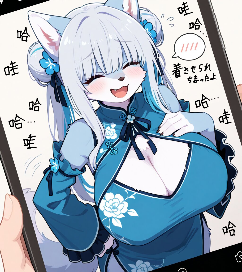 1girl, wolf girl, furry female, snout:1.3, blue fur, fluffy fur, wolf ears, ears up, wolf tail, body fur, gigantic breasts, sagging breasts, silver hair, hime-cut, long hair, colored inner hair, high twintail, double buns, hair over eyes, eyes closed, long bangs, raised inner eyebrows, high collar, neck ribbon with loose ends, revealing clothes, undersized clothes, blue china dress, blue qipao, plum blossoms print dress, sleeveless dress, cleavage, center-opening, cleavage cutout, center-cutout, blue detached sleeves, frill-trimmed sleeves, frilled sleeves, wide sleeves, long side slits, embarrassed, smile, open mouth, laughing, breast suppress, flying sweatdrops, hand on own hip, spoken blush, fake phone screenshot, smartphone, photographed, motion lines, motion blur, motion trail, afterimage, white background, simple background, from front, from above, dutch angle, hair shade, high contrast, digital art:1.1, anime coloring, kawaii, softy, 2D, cute, furry, two tone fur, furry body, perfect body, detailed face, high quality, cute clothes, animal tail, animal ears, solo, masterpiece, correct_anatomy, gddw, pretty and cute, comical, simple, anime, flat color, no lineart, Bright colors, Contour line, pale painting