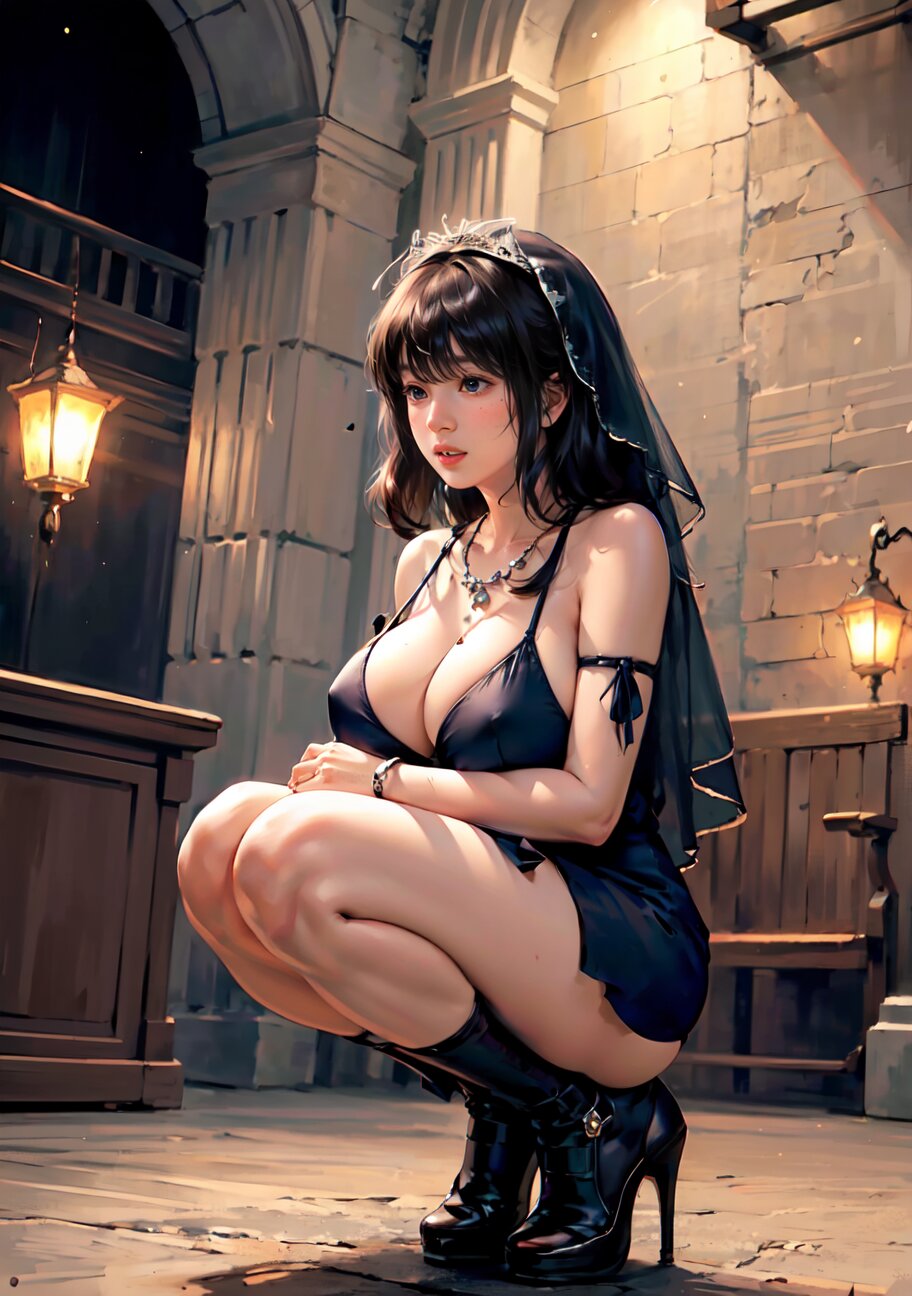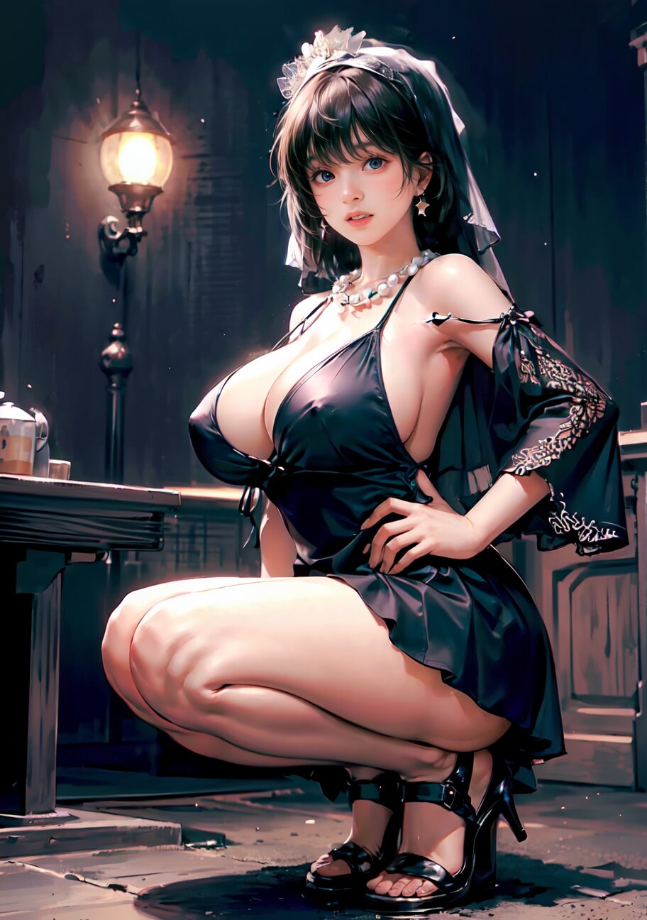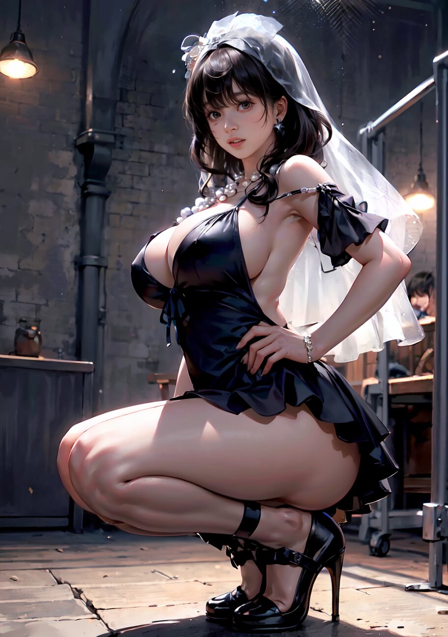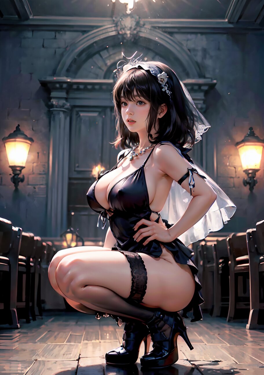 nsfw, nude, from below, (((doggystyle))), (hands on hip:1.4), (8k, Ultra Hi-Res, top quality, Masterpiece: 1.2), RAW photo, (Photorealistic: 1.4), professional lighting, 1girl, 18 years old, (((widow))), ((((black wrap mini dress))), (((huge breasts))), huge ass, bare shoulders, pearl necklace, curvy, squatting, (((full body))), net Veil fascinator, high heels, depth of field, cinematic lighting, (physical-based rendering), at the church, <lora:naoko_v01:0.8>