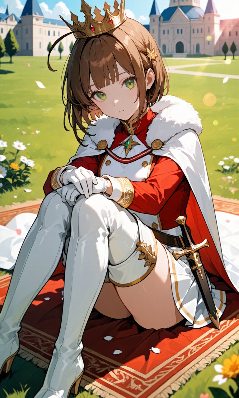 A young boy with a delicate face and expressive green eyes gazes directly at the viewer with a calm, expressionless demeanor. He has short, straight brown hair styled in a bob cut with blunt bangs and a single playful ahoge sticking up. His attire is a striking "Red Prince" costume—a regal, detailed ensemble featuring a white cape, a mini skirt, and long sleeves with white gloves. A small dagger rests at his waist, and he wears a crown atop his head, completing the princely aesthetic. His legs are covered by white, luxurious thigh-high boots as he sits on the ground with his knees drawn up, resting on a luxurious square carpet. The setting is a sunlit grassland near a grand medieval European palace, with scattered flowers and soft sunlight casting gentle lens flares. The atmosphere is serene yet romantic, blending classic academia aesthetics with soft bloom lighting. The image is hyper-detailed, emphasizing photorealistic skin, hair, and fabric textures, creating a masterpiece of refined beauty.