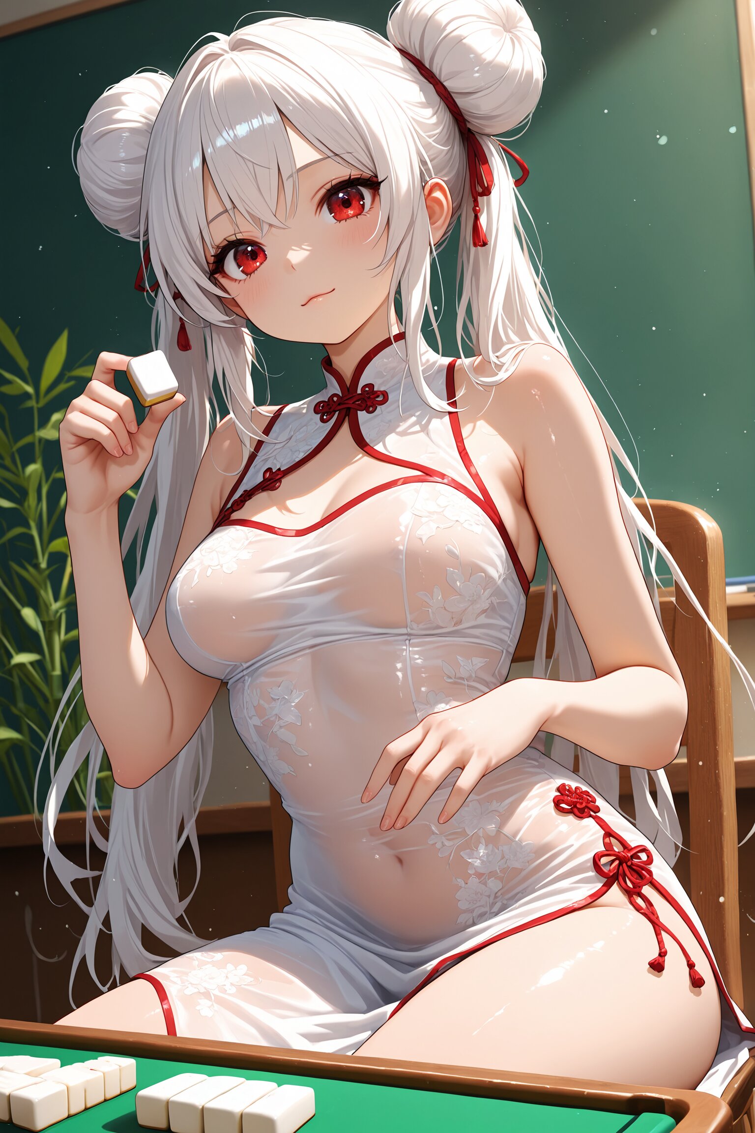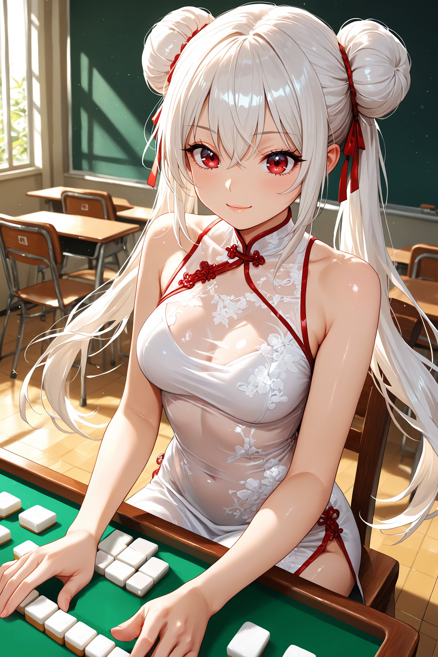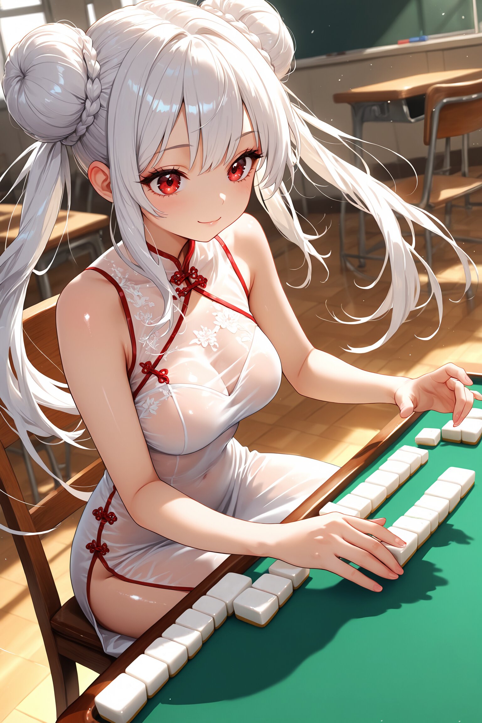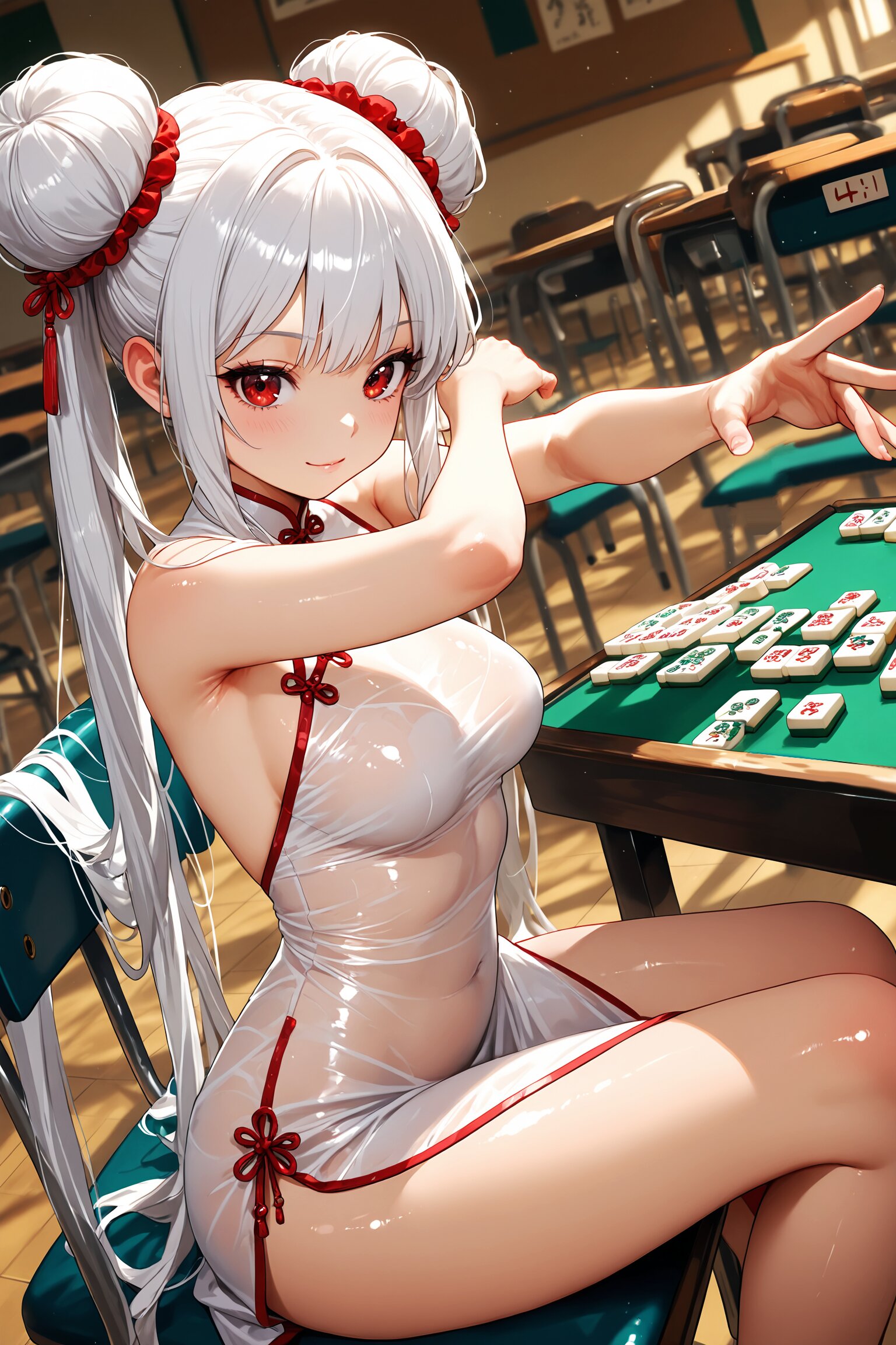 なぜか教室中央にドンと鎮座しているのは、勉強机でも黒板でもなく――麻雀卓。