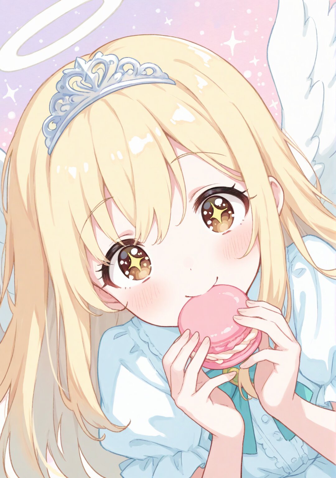 blonde hair, long hair, brown eyes, (white angel wings:1.2),tiara,tareme,, masterpiece、best quality、amazing quality, solo, kawaii, cute, dynamic pose, dynamic angle, looking at viewer, (soft pastel color palette1.5), (pale colors:1.3), watercolor texture, matte finish, subtle shading, minimal contrast,, eating macaron, holding it close to her mouth, sparkling eyes, soft blush, cute smile, zoomed-in portrait, delicate fingers holding the macaron, dreamy pastel background,
