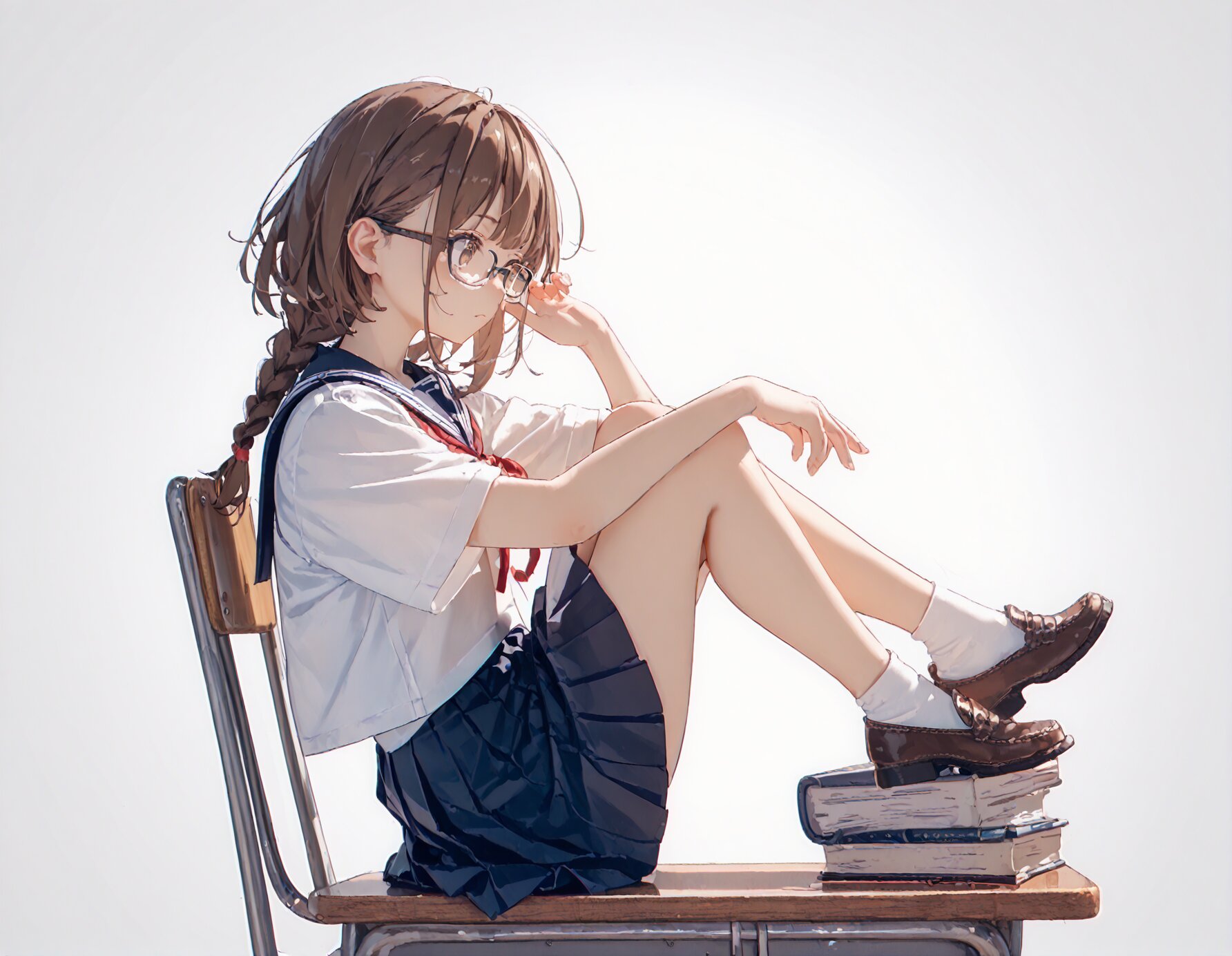 score_9, score_8_up, score_7_up, score_6_up, score_5_up, score_4_up, rating_safe, masterpiece, best quality, high quality, full body shot, side view, distant view, 1 girl, brown eyes, (brown hair), (long braid hair), (glasses), school unifrom, serafuku, White shirt, Navy blue collar, red chest ribbon, navy pleated Skirts, sitting on chair, books on the desk, simple background, (pure white background),