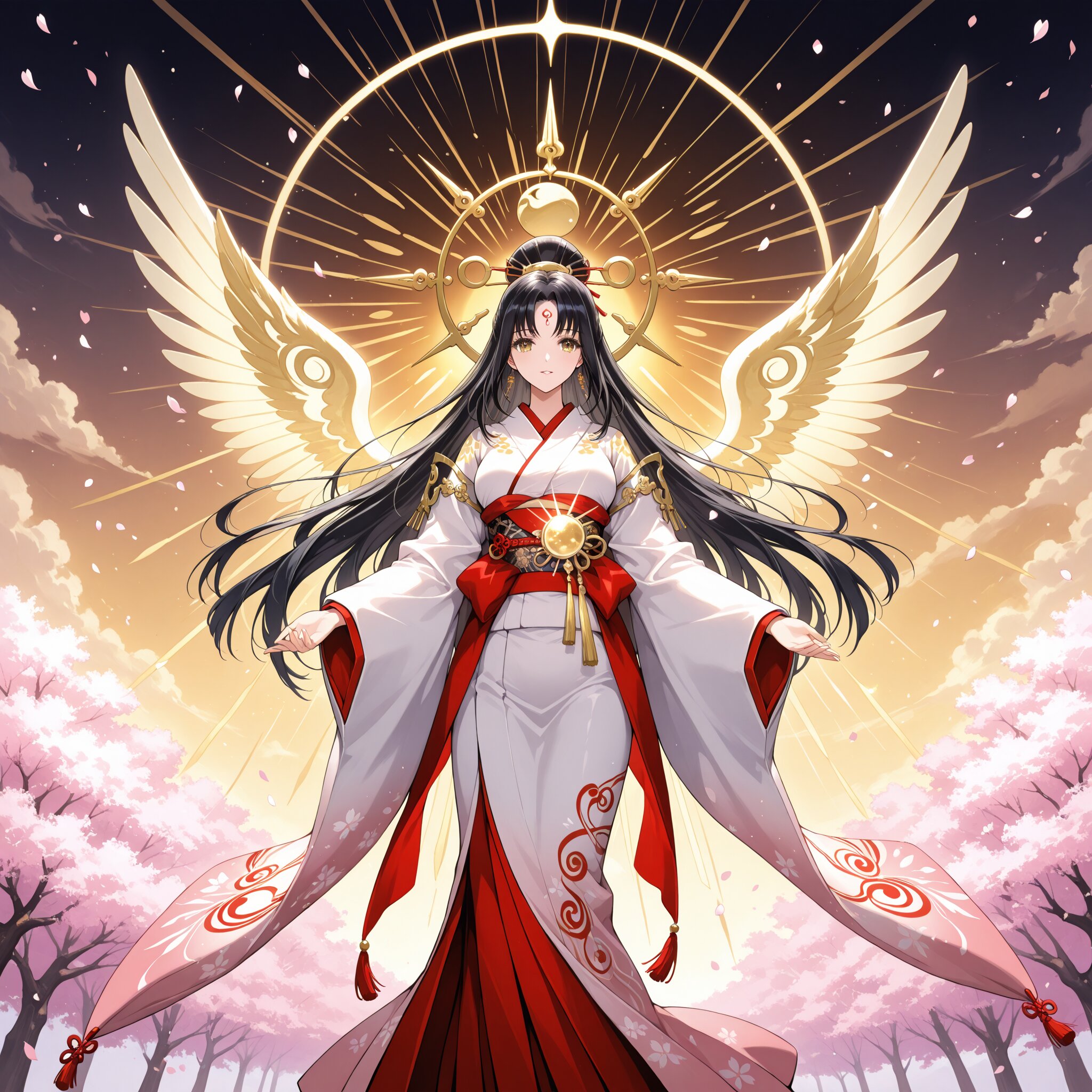 A radiant anime-style goddess inspired by Amaterasu, the Shinto sun deity. She appears as an ethereal young woman with long flowing black hair shimmering with golden light. Her golden eyes glow warmly, wearing an elegant white and crimson kimono adorned with sun motifs. She is surrounded by a halo of sunlight, divine rays illuminating her figure, and cherry blossom petals floating in the air. Highly detailed, delicate, luminous, Makoto Shinkai and CLAMP inspired art.