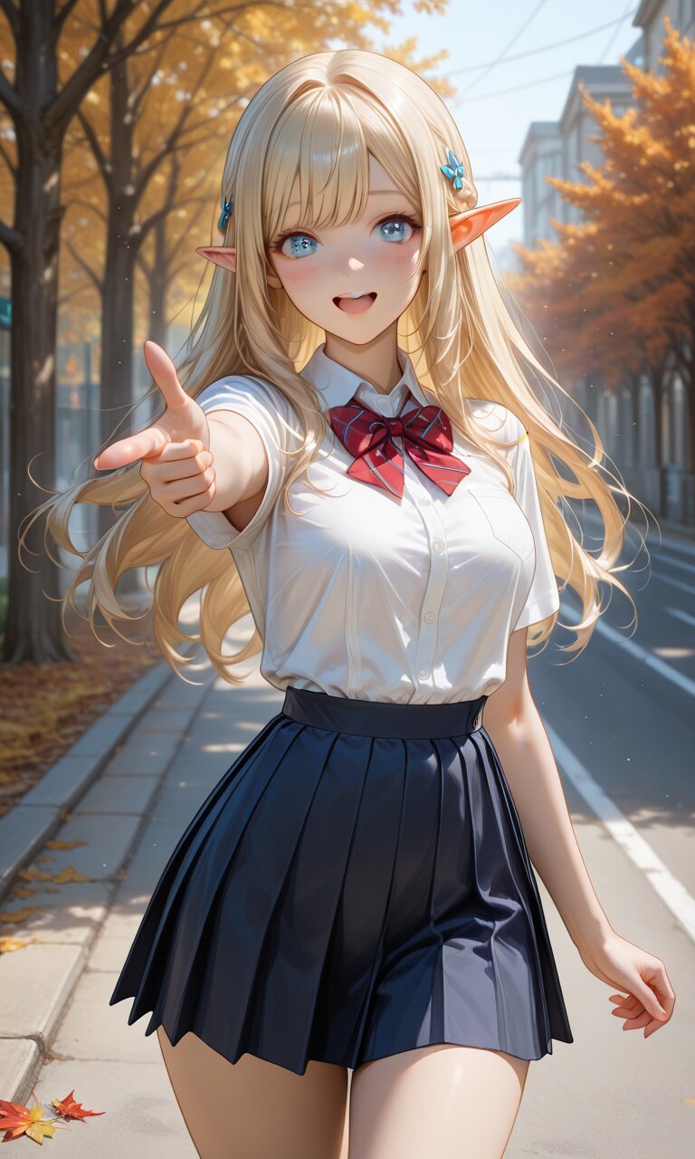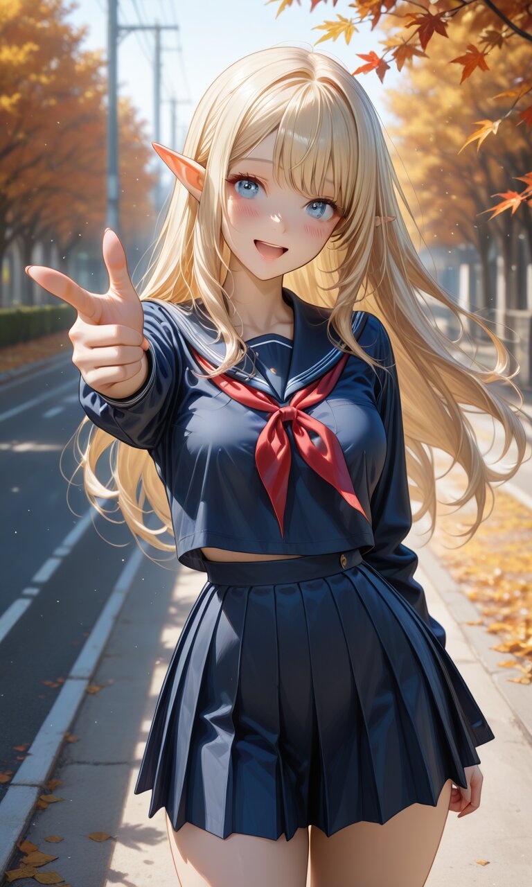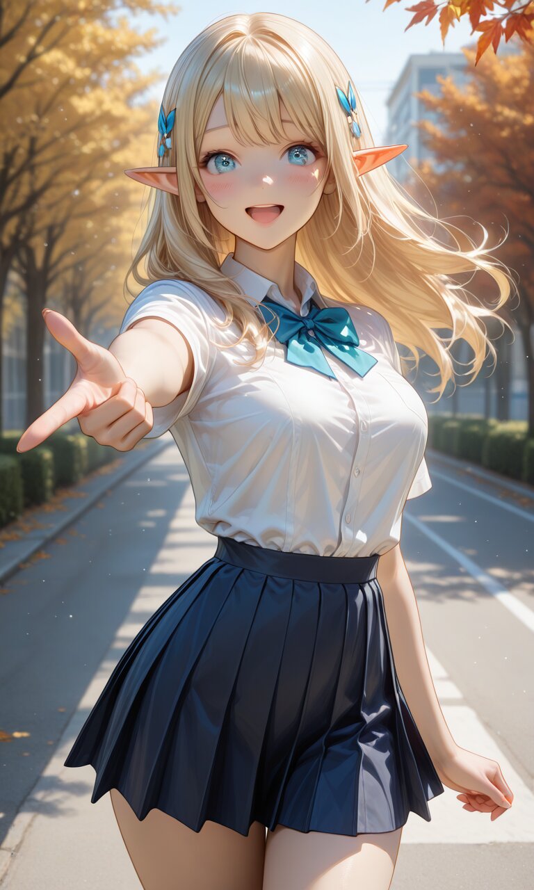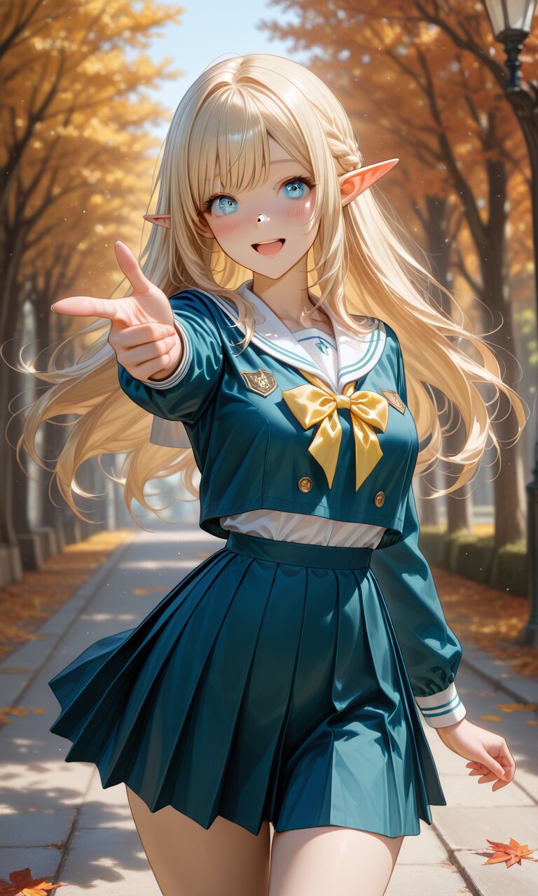 nice hands, perfect hands, perfect anatomy, perfect structure, (On a Morning, the girl standing on the road, gaze at me with an Embarrassed, open mouth happy smile face), outdoors, 1girl, solo, cowboy shot, from front, reaching arm, finger gun at viewer. (She is wearing an autumn fashion, school uniform), ((Countless light particles floating around)), ultra detailed lips, ultra detailed face and hair, beautiful eyes, kawaii, adorable, cute, elf girl, (apatite eyes with CGI Effect), (deep blonde hair:1.2), medium breasts, wide hip, volumetric lighting <lora:elf-san_alpha1(AnimagineV31):0.3> <lora:elf-san_alpha4(IL1.0):0.4>, anime style, anime color,, masterpiece, amazing quality, very aesthetic, high resolution, ultra-detailed, absolute, newest, 2d, semi-realistic, moe heroine, sharp focus,