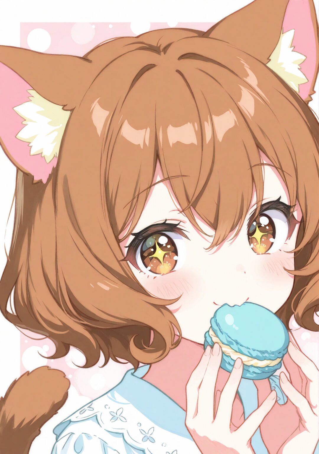 brown cat ears, brown eyes, chestnut brown wavy bob hair, hair between eyes, loose inward curls, natural cat tail,, masterpiece、best quality、amazing quality, dynamic pose, dynamic angle, looking at viewer, (masterpiece:1.3), (best quality:1.2), dreamy pastel bokeh, soft rim light, crisp anime lineart, soft cell shading, high detail, elegant atmosphere, eating macaron, holding it close to her mouth, sparkling eyes, soft blush, cute smile, zoomed-in portrait, delicate fingers holding the macaron, dreamy pastel background,, (soft pastel color palette1.5), (pale colors:1.3), watercolor texture, matte finish, subtle shading, minimal contrast,