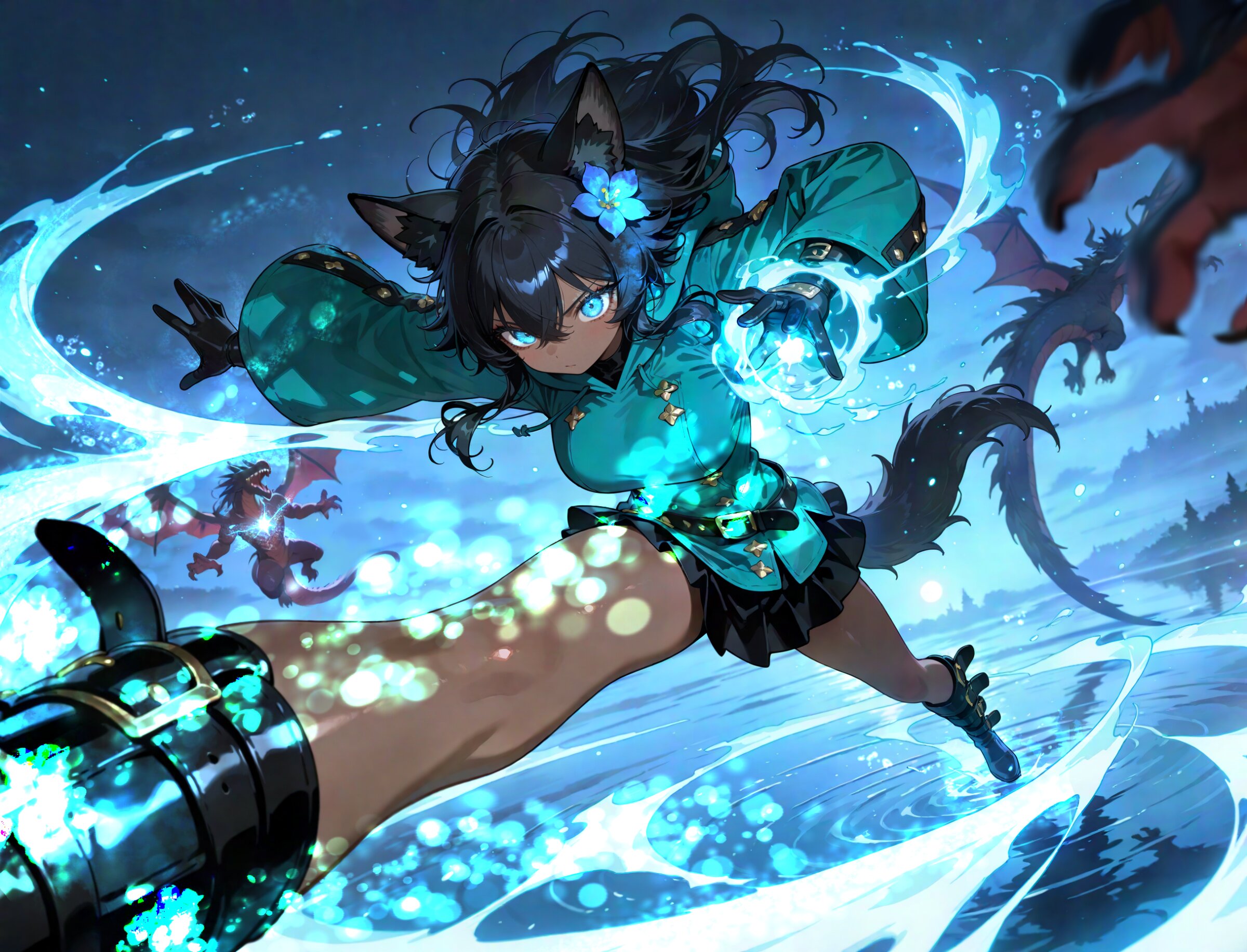 (close up:1.0) from above from behind facing away, looking at monster 1girl, black wolf ears, dark skin, young beautiful girl, large breasts, tall, wolf tail, (aristocratic features), (Black Hair:1.2) (disheveled long hair over ears:1.3) messy hair ornament flower, (perfect turquoise eyes:1.3) long eyelashes,, wearing turquoise hood down and white tube top leather gloves, lether miniskirt, belt boots, turquoise hoodie, water magic, , kung fu attack, kung fu pose, kung fu action, (swirling energy,energy magic,energy:1.2), water magic, floating water balls, great clear water, reflection focus, , medieval fantasy world, battle (huge burgundy silhouette of dragon, faceless monster:1.3), (burgundy monster:1.2), duel, fighting, danmaku, midair incoming attack, super fine concept art, hard surface, 8K, unreal engine, masterpiece, best quality, amazing quality, very aesthetic, absurdres you can add scenery, (volumetric lighting), To make the background more distinctive. professional art lots of details, , overexposure, shiny-glistening, (watercolor style:0.5), (pastel color style:0.5) 4ur4_illu,shiny, glowing, glowing particles, glowing light particles, light particles, , <lora:noline (1):-0.5> <lora:sdxl2-flat2-512b:0.2> <lora:facelightup_xl_v10:0.5> <lora:V2_yakumo_alchemy:0.5> <lora:Aura_illu:0.1>