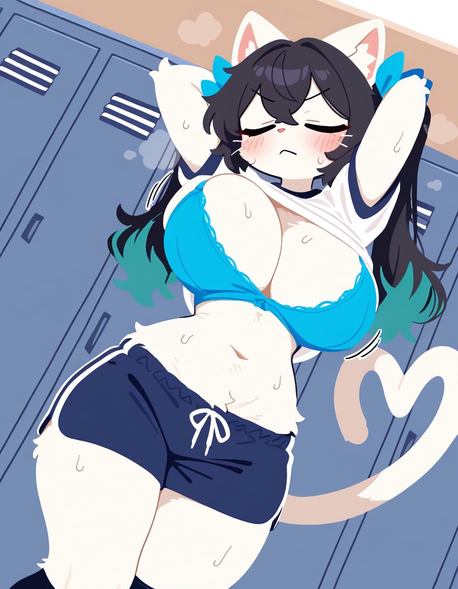 1girl, furry female, fluffy fur, white cat girl, white body fur, solo, short female, curvy, loli, huge breasts, slim, wide hips, thick thighs, white cat ears, whiskers, white cat tail, heart tail, black hair, colored tips, aqua tips, long hair, twintail, closed eyes, tsurime, v-shaped eyebrows, closed mouth, expressionless, unemotional, layering, large hairbow, blue hairbow, gym clothes, white gym shirt, blue bra, huge bra, blue gym shorts, black kneehighs, skin tight, skindentation, heavy sweat, heavy steaming body, hands up, arms up, arms behind head, undressing, shirt lift, lifting the shirt, grabbing the shirt, bouncing breasts, unaligned breasts, motion lines, motion blur, motion trails, afterimage, from front, three-quarter view, dutch angle, looking ahead, looking at locker, indoors, locker room, changing room, smooth, digital art, high contrast, stylized, kawaii, cute, masterpiece, cute pastel colors, soft pastel colors, flat color, no lineart, furry, furry body, perfect body, detailed face, high quality, hot, animal tail, animal ears, solo, big breasts, voluminous thighs, correct_anatomy, Bright colors, Contour line, pale painting, gddw, detailed_hands, flat color, no lineart, flat color style, simple coloring style, solo, masterpiece, flat color, no lineart, furry, furry body, perfect body, detailed face, high quality, hot, animal tail, animal ears, solo, big breasts, voluminous thighs, Bright colors, Contour line, pale painting, gddw, detailed_hands, flat color, no lineart, flat color style, simple coloring style