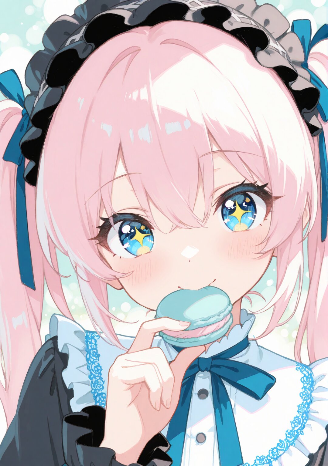 gothic lolita girl, (pink twin tails:1.3), blue eyes, bangs covering between eyes, (blue ribbon with gold embroidery1.2), frilly gothic dress, masterpiece、best quality、amazing quality, dynamic pose, dynamic angle, looking at viewer, (masterpiece:1.3), (best quality:1.2), dreamy pastel bokeh, soft rim light, crisp anime lineart, soft cell shading, high detail, elegant atmosphere, eating macaron, holding it close to her mouth, sparkling eyes, soft blush, cute smile, zoomed-in portrait, delicate fingers holding the macaron, dreamy pastel background,, (soft pastel color palette1.5), (pale colors:1.3), watercolor texture, matte finish, subtle shading, minimal contrast,